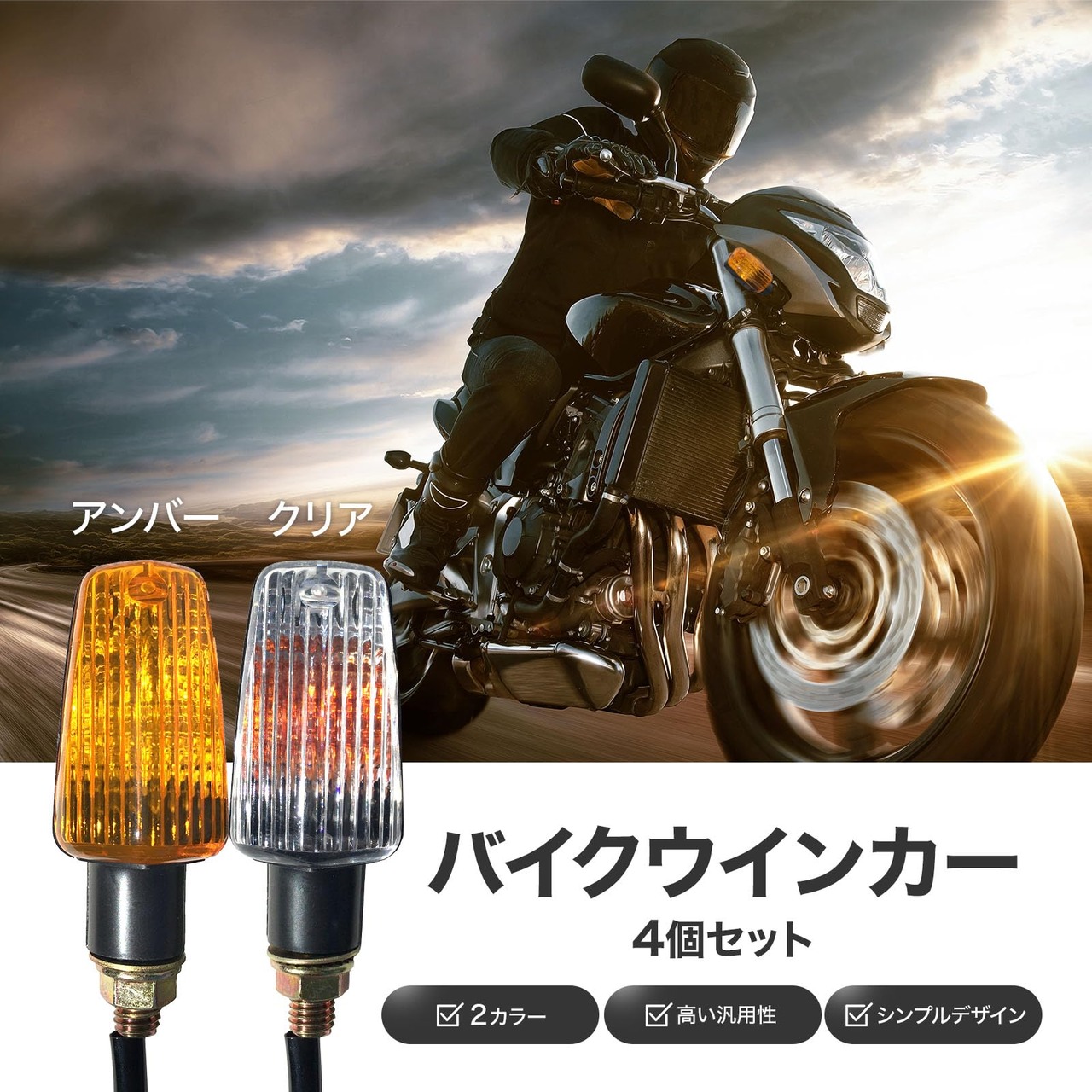 セット内容:シンプルなミニサイズで、スタイルに合わせてクリア レンズ ウインカー 4個 セットとアンバー レンズ ウィンカー 4個 セット2色からお選びいただけます。旧車のカスタム ドレスアップにもご利用いただける、バイク 汎用 ウインカーです。