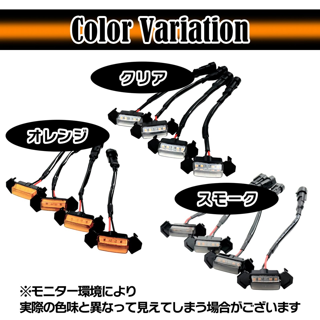 【バリエーション】発光色とカバーケースの組み合わせ:発光色アンバーが不点灯時にも存在感を示すオレンジレンズと存在感を和らげるスモークレンズ・クリアレンズをご用意致しました。