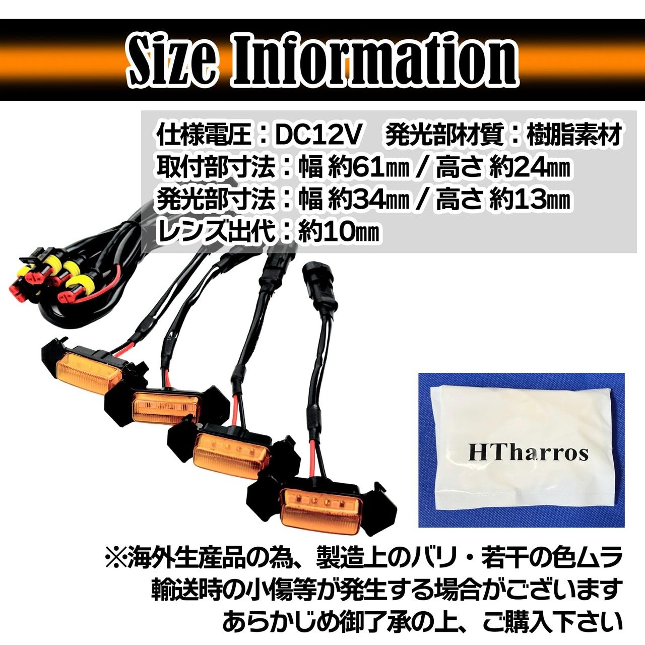 グリルマーカーを取付ける事により、夜間や悪天候時の視認性がアップする他、通常時でもグリル内からの輝きは人の目を引くドレスアップ効果がございます。トヨタ タコマ TRD プロ グリルなど(グリルがハニカム形状の車種に取り付け可能)仕様電圧:DC12V、発光部材質:樹脂素材 取付部寸法:幅約61mm、高さ約24mm、発光部寸法:幅約34mm、高さ約13mm、レンズ出代約10mm【バリエーション】発光色とカバーケースの組み合わせ:発光色アンバーが不点灯時にも存在感を示すオレンジレンズと存在感を和らげるスモークレンズ・クリアレンズをご用意致しました。発光部配線長(約20㎝)ハーネス調170㎝ DC 12V 黒線とアース、赤線とACCまたはデイライトへ接続しご使用下さい。ケース、配線とも防水処置を行っておりますが、長くお使い頂く為に追加のシール処理をオススメいたします。取り扱い説明書はありません。適合確認、取付のサポートは行っておりません。画像及び寸法をご参考にご判断ください。※海外生産品の為、製造上のバリ、若干の色ムラ、輸送時の小傷等が発生する場合がございます。またモニター環境により実際の色と違って見える場合がございます事、予めご了承の上ご購入下さいませ。