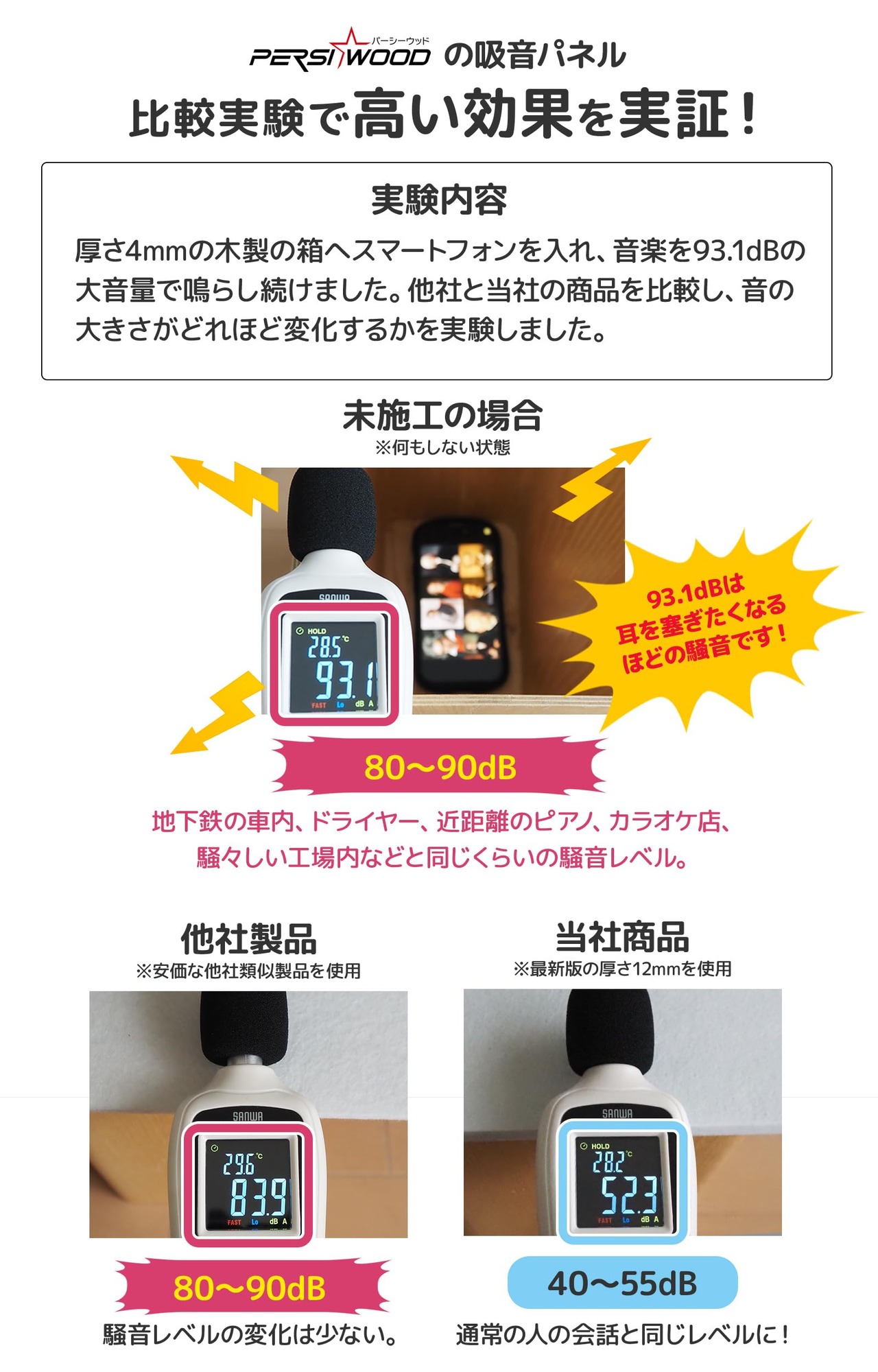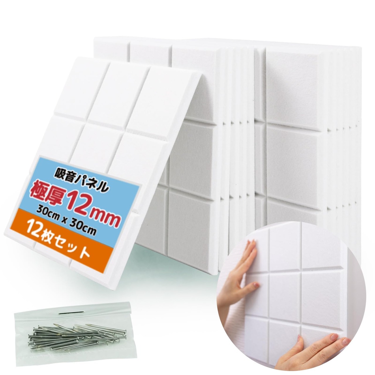 ●300mm×300mm 12枚セット ●不快な音を和らげるフェルトボードです。 ●うるさく感じる生活音を和らげる ●壁に貼ったり床に敷いたりするだけで不快な音を和らげる、吸音する高密度のフェルトボード。 ●テレビやオーディオ、楽器など音の発生源近くに貼り付けるだけの優れもの。 ●繊維を丹念に絡ませて高圧縮したフェルトボードは最上級の細かな品質を実現。 ●吸音 防音とは 防音には3つの基本要素があります。 ★遮音(音を伝えない・はね返す) ★吸音(音を吸収する) ★防振(壁など) 吸音パネルは吸音性のある材質を使っています。 空気の振動によって伝わる音は吸音材にぶつかるとその振動を吸収しはね返る音を少なくします。 こうして周りの雑音を和らげるのです。 100%ポリエステル製の繊維を高圧縮加工により高密度の板状に成形した硬質吸音フェルトボードは吸音材材として様々なところで利用されています。 さらに 不快に感じる音を特に和らげる 吸音パネルは人が不快に感じるとされる周波数で高い吸音率が見込まれます。 つまり 吸音パネルを音の発生源の近くに設置すれば、不快に感じる音を和らげてくれる。 吸音するパネルだから 壁などから反響する音も吸収してクリアな音に。 テレビの後ろに吸音パネルを設置するだけで音を吸収してくれるので簡単に音漏れを軽減。 室内の音の響きも調節出来ます。 重ねて使用で効果アップ 吸音パネルを2枚重ねにすると音を遮る性能をより発揮します。 床などへの衝撃音も吸収します 床への衝撃音など人間の生活音も低減させます。 椅子を引きずる音や小さな子供のドタバタ歩きの音も和らぎます。 床に敷く場合は両面テープ等で固定してください。 ●ローコスト 吸音パネルなら低コストも実現 工事などの必要なく、必要な部分だけの設置でOK! また子供が小さい時だけなどの一時的な設置や追加で設置などにもラクラク対応可能です。 低コストでこんな用途にも使えます。 ●クッション性もあるので壁面への保護材に ●音をよりクリアな音質に ●ポリエステルフェルトは断熱性にも優れています ●オフィス、静かに会話したい場所にも最適 設置におすすめの場所 住宅・マンション・スタジオ・楽器部屋・キッズルーム・幼稚園・オフィス・会議室・マンション・エントランス ●楽々取り付け 取付けは簡単 壁に貼ったり床に敷くだけ 女性でも簡単に設置していただけます。 基本は並べて貼るだけ カッターでの加工も可能 内装に合わせてピッタリ仕上げることもできます。 カッター等で加工可能 コンセントやスイッチなどの避けたい部分や設置幅に合わせて簡単に切り取れます。 虫ピンで取り付け チリ外し簡単で痕も目立ちません。 石膏壁におすすめです。 ホットメルトで取り付け 養生テープの上にホットメルトでの取り付けも可能です。 直接傷もつきません。 マジックテープで取り付け コンクリート壁などに有効。 付け外し可能な場合にもオススメです。