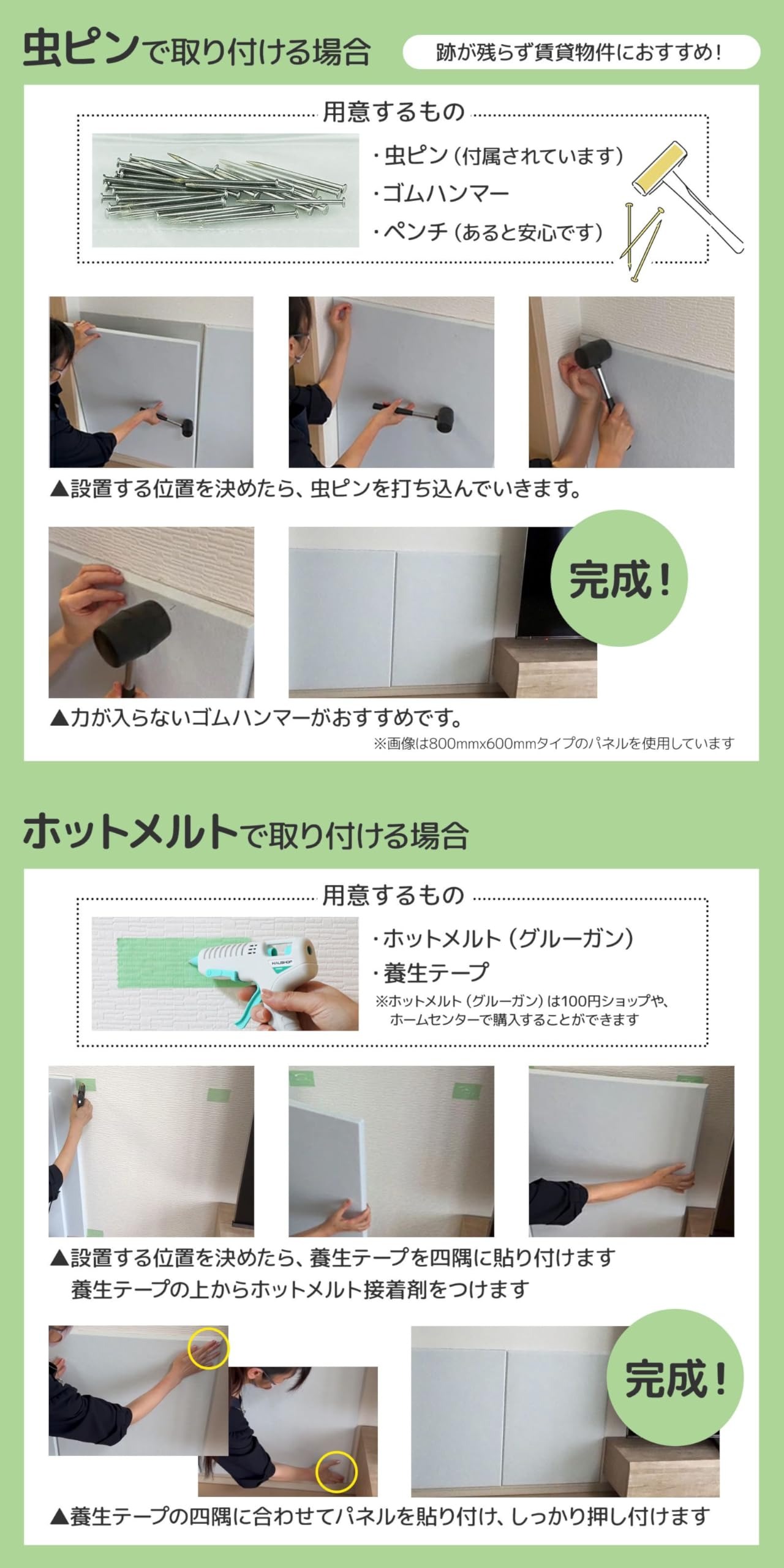 【選べる取付方法】虫ピン/マジックテープ/養生テープの上にホットメルトを使用するなど状況に応じて選べます