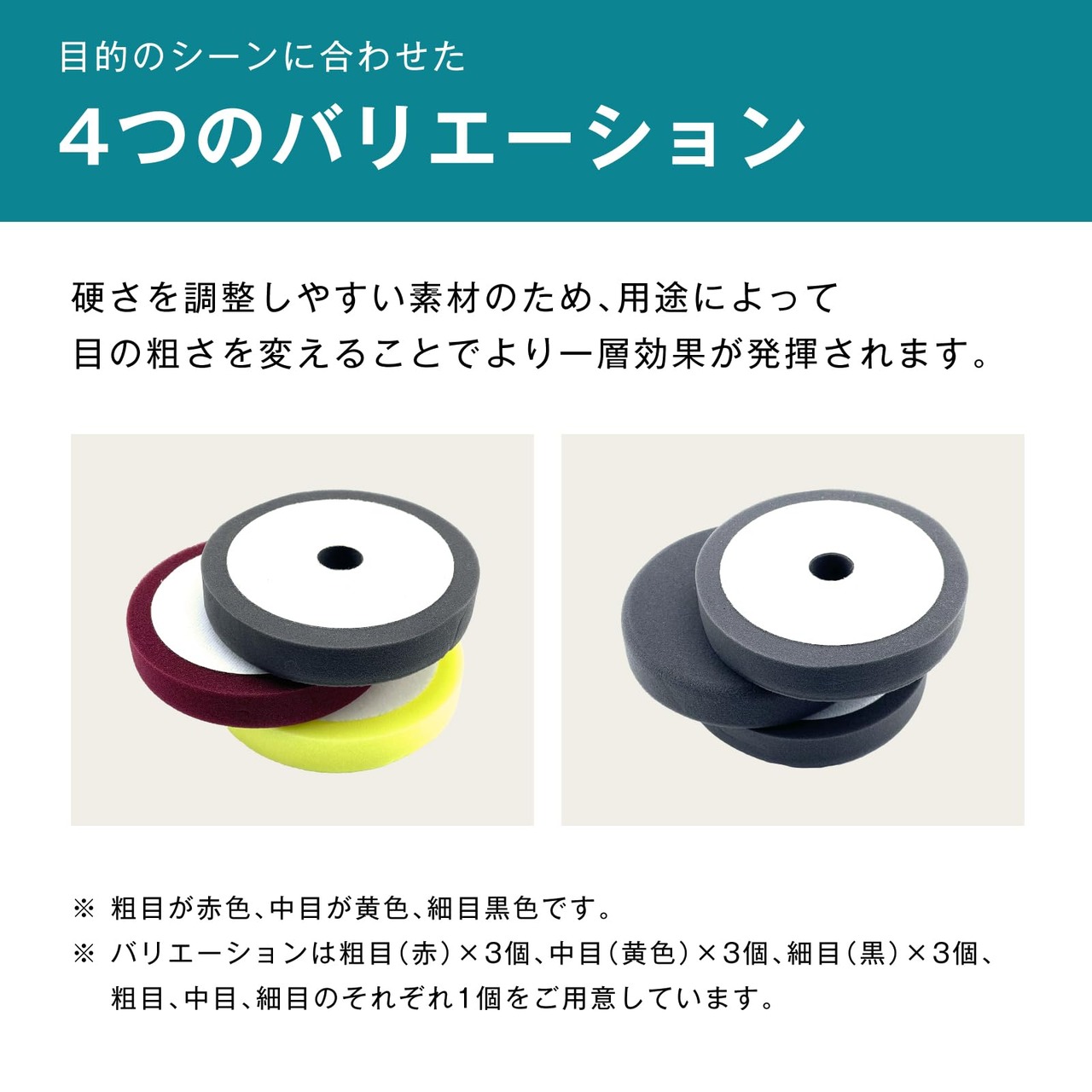 洗車等でご使用頂ける、ポリッシャースポンジです。スポンジバフは柔らかく研磨力が低いことが特徴で、水垢や浅い傷などを落とす際に適しています。弾力のある使いやすいスポンジですので、ワックスがけや研磨、艶出しにご活用頂けます。 電動ポリッシャーに取り付けてご使用頂くことも可能です。ボディの微妙な湾曲しているラインにもピッタリフィットします。 マジックテープ式なので簡単に取り外しが出来ます。さらに汚れても洗って再利用することも可能です。 洗車以外の用途でも、大きな窓ガラスやお風呂掃除などの様々なシーンでご利用いただけます。硬さを調整しやすい素材のため、用途によって目の粗さを変えることでより一層効果が発揮されます 【バリエーション】各サイズの目3個セット、又は細目中目粗目3個セット、いずれかをお選びいただけます。【サイズ】 直径約150mm、パッド部分約120mm,内径約25mm、厚み約30mm ※各商品同一サイズです。