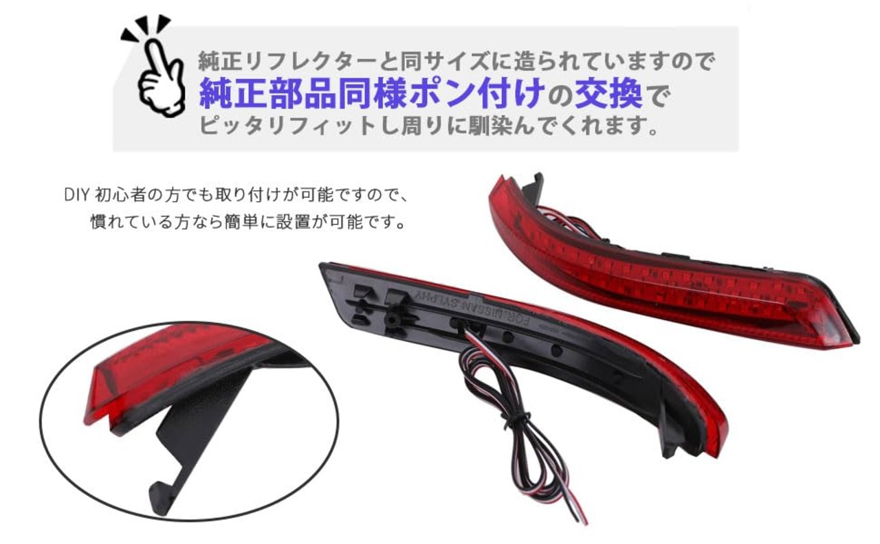 日産 セレナ C26系用 LED リフレクター リア バンパー ライト レッドレンズ 汎用 社外品になります。 <br><br> 適合車種:日産 セレナ C26系 XG X G ハイウェイスター C26 NC26 FC26 FNC26 2010年11月~ / <br> エルグランド E52系 TE52 TNE52 PE52 PNE52 2010年8月~ / ブルーバード シルフィー G11系 G11 NG11 KG11 2005年12月~ / <br> プレサージュ U31系 TU31 TNU31 PU31 PNU31 <br> 2003年6月~2008年7月 / ウイングロード Y12系 Y12 NY12 JY12 2005年11月~ 等 <br><br> 純正適合品番:右:26560-8990D/26560-EW00A 左:26565-8990D/26565-EW00A <br> レンズカラー:レッドレンズ セット内容:本体左右 配線:赤:スモール 白:ブレーキ 黒:アース<br><br> リアバンパーのリフレクターがスモールとブレーキライトとして使用できるようになります。<br><br> スモールやブレーキのランプが増えますので、夜間・悪天候時の視認性がアップします。<br><br> 純正リフレクターと同サイズに造られていますので、純正部品同様ポン付けの交換でピッタリフィットし周りに馴染んでくれます。<br><br> お車のドレスアップが趣味の方、カスタム好きな方にもお勧めのパーツです。<br><br> さりげなくリフレクターをカスタムしている車は、センスの良さを感じさせカッコよくなります。<br><br> DIY初心者の方でも取り付けが可能ですので、慣れている方なら簡単に設置が可能です。<br><br> お気に入りのパーツでカスタムするとドライブが楽しくなりますので、最初に手を入れるパーツとして取り付けしてみる事をお勧めします。<br><br> 大切な愛車のリフレッシュパーツとしても違和感なく取り付け可能ですので、ノーマルの雰囲気を壊したくない方にオススメのLEDリフレクターリアバンパー ライトです。<br><br> ※取扱説明書は付属しておりません。<br><br> ※取り付けに関するサポート及びお問い合わせの対応はしておりませんのでご了承お願い致します。<br><br> ※取り付けに自信のない方は専門の業者様、または整備士に依頼して取付けされることをお薦め致します。<br><br> ※取り付け可能車種の質問等にはお答えできませんのでご了承お願い致します。<br><br>