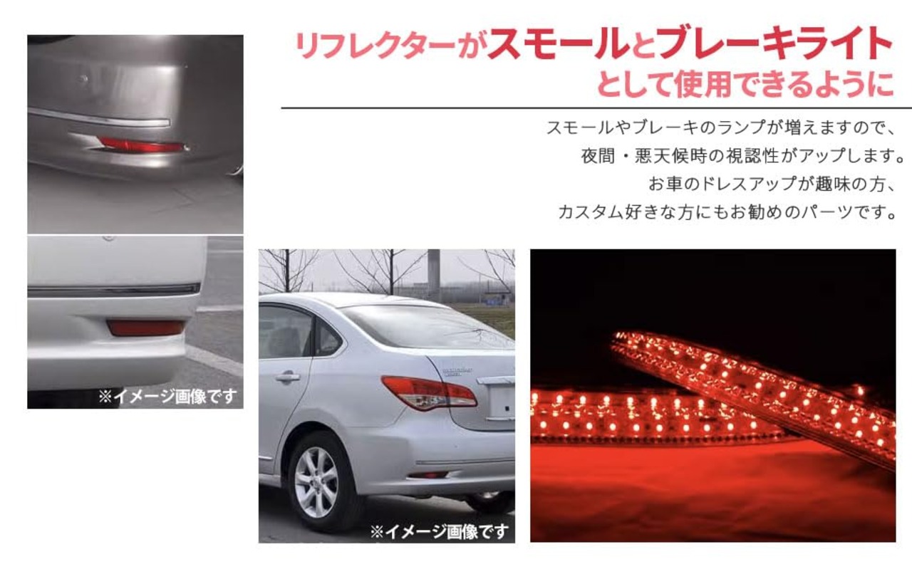お気に入りのパーツでカスタムするとドライブが楽しくなりますので、最初に手を入れるパーツとして取り付けしてみる事をお勧めします。大切な愛車のリフレッシュパーツとしても違和感なく取り付け可能ですので、ノーマルの雰囲気を壊したくない方にオススメのLEDリフレクターリアバンパー ライトです。