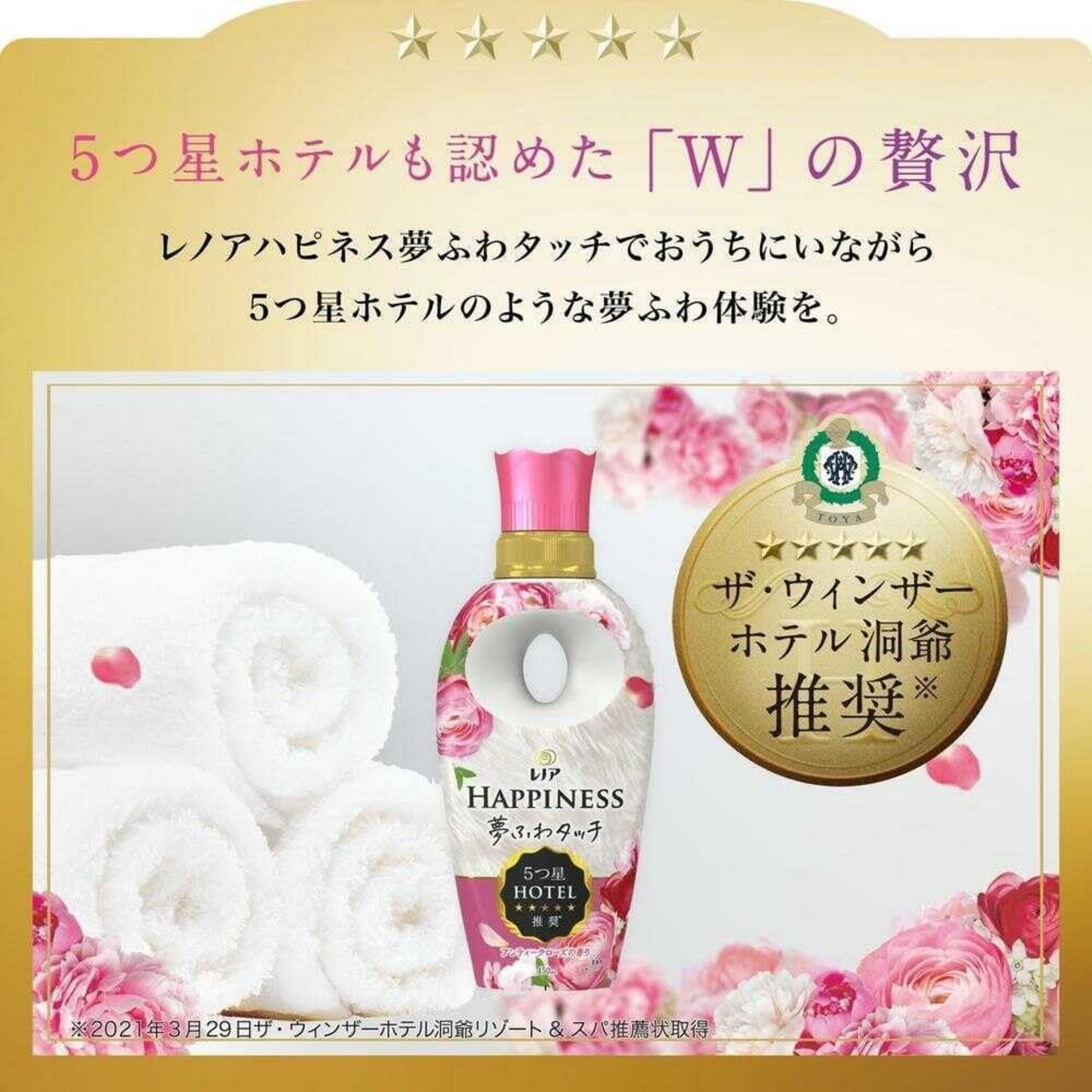 新レノアハピネス夢ふわタッチは、5つ星ホテルも認めた香りも肌ざわり。レノアハピネス夢ふわタッチで、おうちにいながら5つ星ホテルの贅沢を体験してください。 秋冬は乾燥しやすいから、ニットのゴワゴワ・チクチクが気になりがち…新レノアハピネス夢ふわタッチなら、衣類をシルクの様になめらかに洗い上げるから、ニットももうチクチクしない*! (*コットンニットで検証) 最高量*1の柔軟成分を配合しているから、5つ星ホテルタオルのような肌ざわりを83%が実感*2しています。(*1 過去10年レノアハピネスにおいて、*2 「華やかに香るアンティークローズの香り」使用。P&G消費者調査[n=108]による) 1週間長続きする*贅沢な香り。レノアハピネス夢ふわタッチなら5つ星ホテルも認める贅沢な香りが1週間楽しめます。(*保管状態にて) 華やかに香るアンティークローズ。ローズとピオニーが主役の女性らしく甘い香りで、しあわせな気分にみたされます。 レノアの柔軟剤は、ドラム式洗濯機や自動投入洗濯機でもお使いいただけます! 詳細の使用方法や使用量は、製品裏の説明をご覧ください。