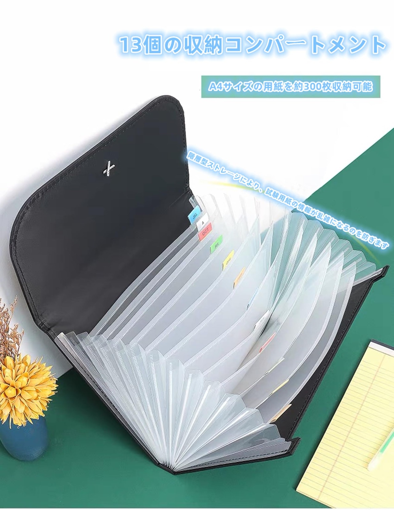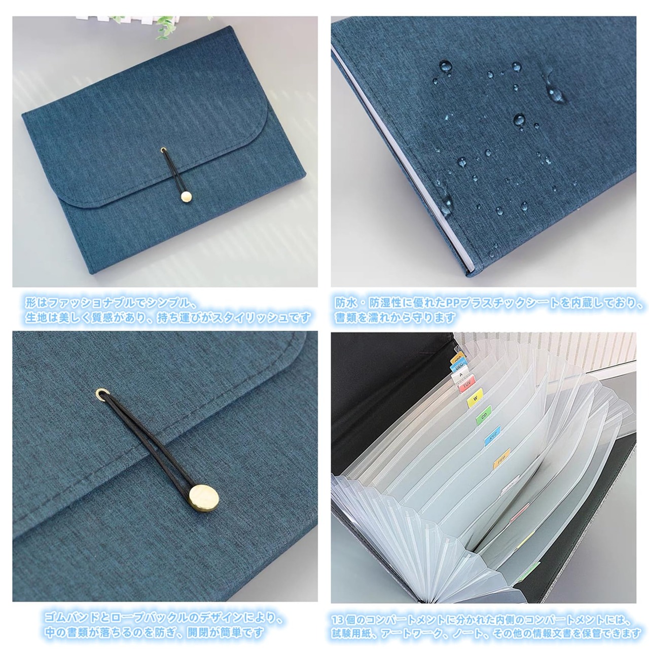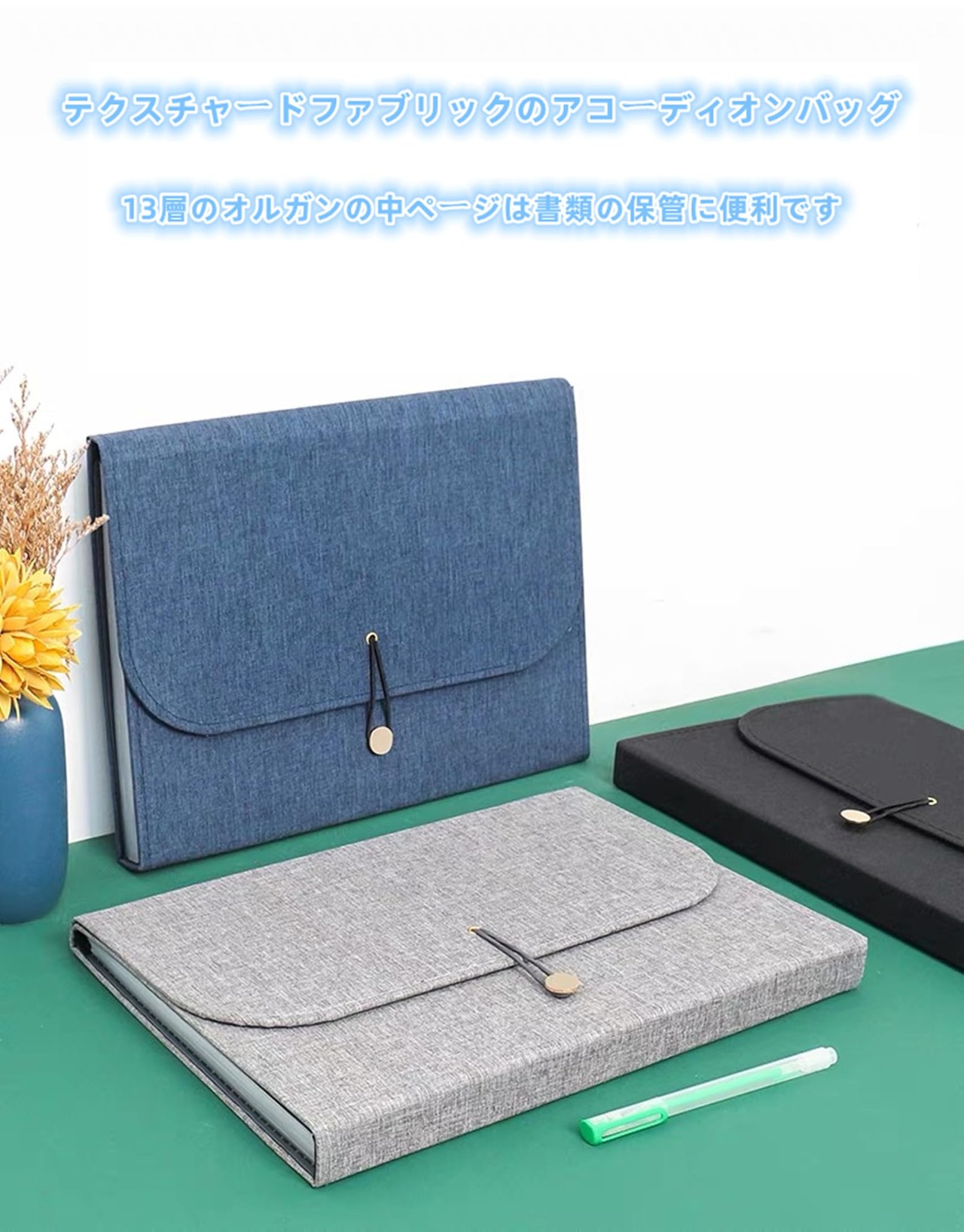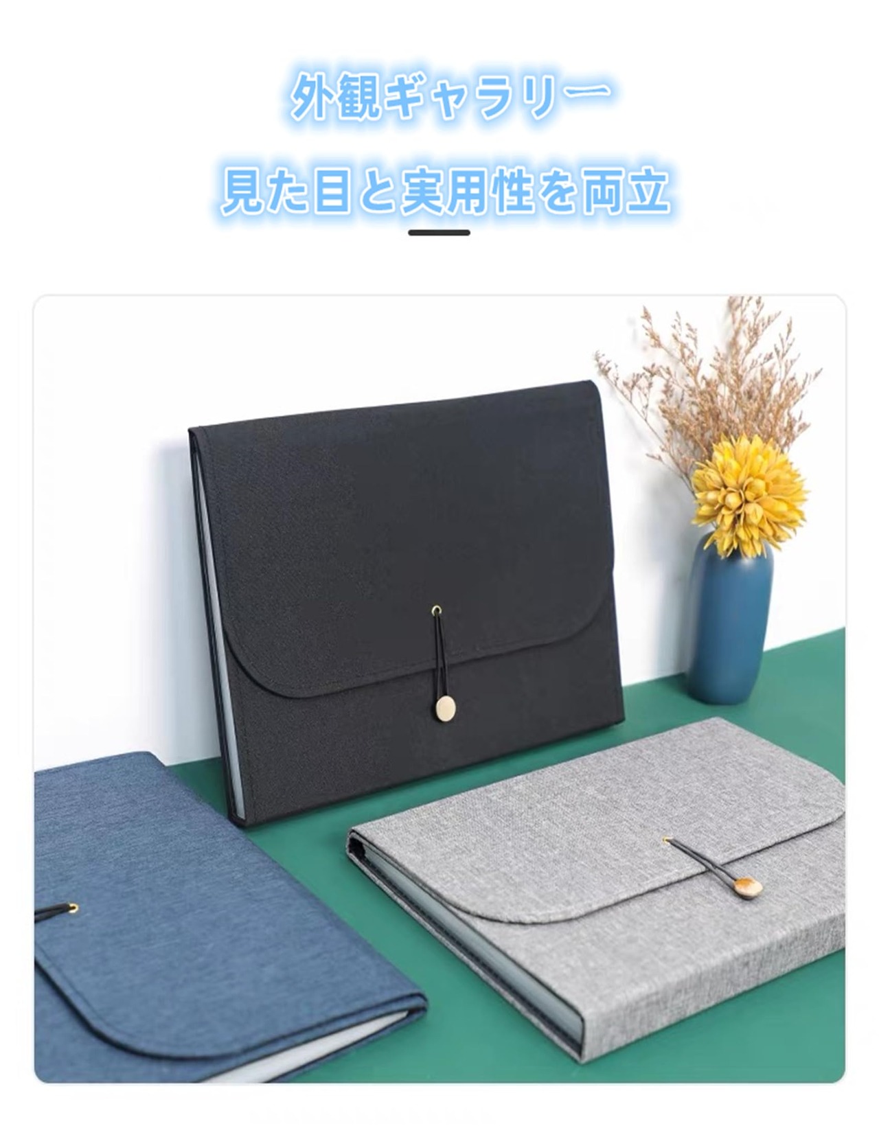 製品詳細<br> 素材:布製PPプラスチック<br> シートサイズ:レター、A4<br> このフォルダーは、商業的な機会、オフィス文書の保管、家庭用文書の保管、就職の面接、学校などに適しています。<br> 旅行や会議など普段使いにも適した薄型フォルダーです。<br> この美しくユニークなファイルフォルダーは実用的なので、友人、教師、同僚、顧客、パートナーへの素晴らしい贈り物です。<br> 書類をよく使う人に最適なA4 ドキュメントファイル 束になったクリアファイルでは書類が見つけにくい・・・、プリントが曲がってる・・・、留めていたクリップが他の資料に引っかかって取れた・・・etc。GEMZISのドキュメントファイル 書類収納ケースを使うことでこのような煩わしさから解放されます。書類をきっちり分類し、クリアファイルもそのまま収納可能。書類をまとめて持ち運びでき、お目当ての書類をすぐに取り出すことができます。あの資料を持ったっけ?がなくなる安心感をぜひ味わってください。<br> 今までになかった高級感のあるハードカバー製 今までの書類ケースのイメージを覆すそのシンプルでクールなデザインはさまざまなシーンで好印象を与えることができます。一般的な全面ポリプロピレン(PP)製のドキュメントファイルと比較し高い耐久性を誇るハードカバーは防水性能も備えています。ワンタッチで開閉できるストラップにより、書類が多くてボタンを留められないということもありません。スマートに書類の出し入れが可能です。<br> &nbsp;使うシーンを選ばないユニセックスデザイン 持ち運びに特化したスリムタイプのデザインなのにしっかり書類を収納できます。サイズは約33cm x 24.5cm x 3cm。収納力を確保しながらも厚みを抑え引っかかりなくカバンへも出し入れできます。洗練されたユニセックスデザインの外観により、営業や学校のプリントの収納などシーンを選ばずお使いいただけます。毎日使う書類ケースだからこそいい物を使いたい方にぴったりの製品です。<br> すぐに見つかる!書類をスマートに出し入れ可能な仕切り スリムタイプなのにしっかりと開くことのできるアコーディオンタイプのじゃばら仕切りにより、目的の書類を素早く見つけることができます。13ポケットあるので12月別+アルファで整理したり、会議や授業別に合わせて書類を分類できます。 また本製品にはカラフルなインデックススリットを付属しています。付け替え可能なので分類用途が変わっても目的に応じてインデックスを整理できます。裏面は平らな構造になっているので、膝の上でバインダーがわりに書類に書き込むことも可能。プレゼン資料やテキストなど持ち物が多い学生にもぴったりです。<br> 細部のこだわりのロールアップ構造。A4クリアファイルも入るサイズと高い耐久性 仕切りはしっかりした厚みがあるのでペラペラして書類を入れにくいということもありません。また、ファイルポケット上部のエッジ部分はロールアップ構造により耐久性を高め手を切ったりケガの心配もありません。A4サイズのプリントやA4クリアファイルを折りたたまずにきれいに収納できます。