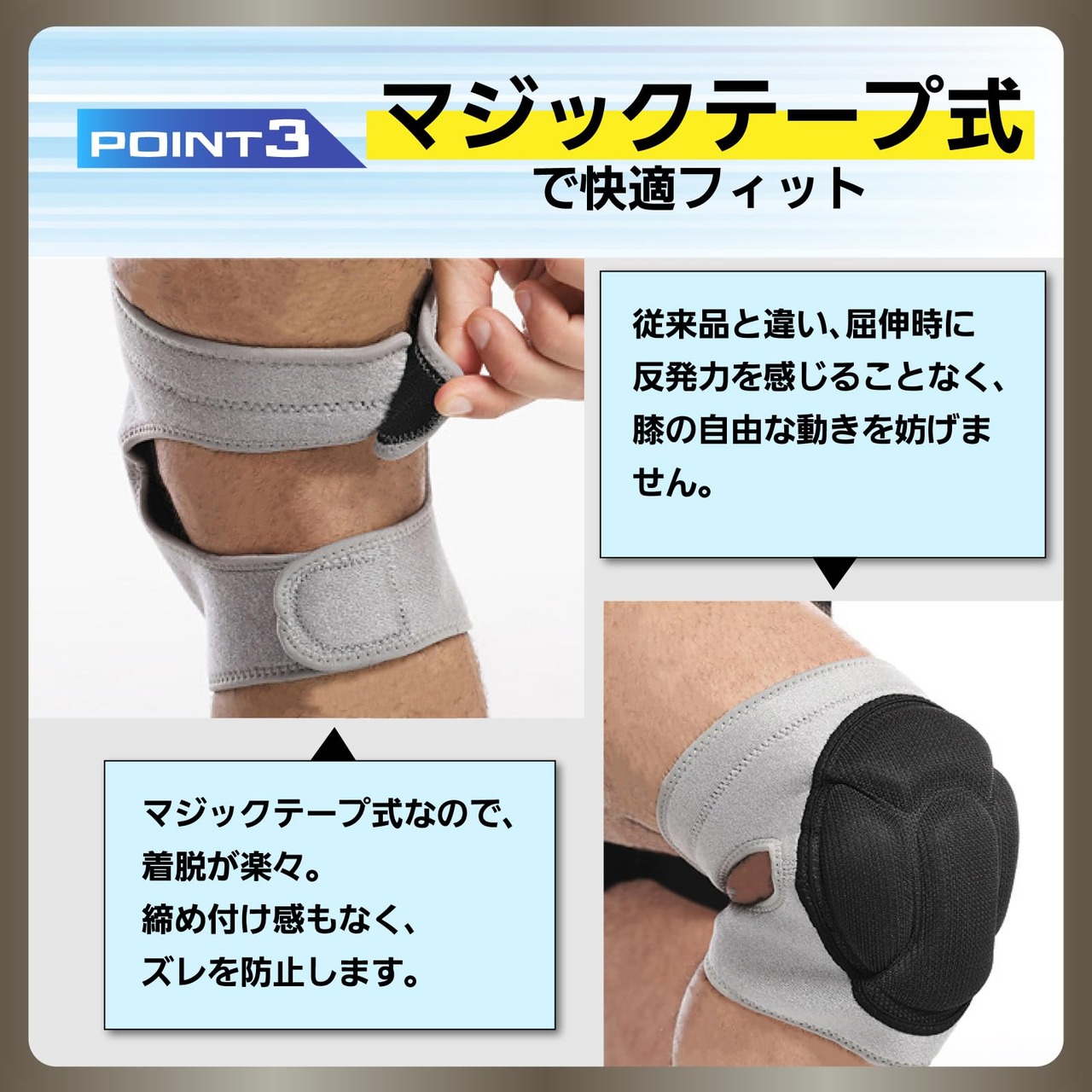 ✅【 マジックテープ式で自由な動きを! 】足のつま先から入れる膝のサポータータイプは一見便利そうに見えますが、サポータータイプは膝パッド(クッション)があるため、屈伸時に強い反発力を感じることがあります。スノーボードやスキーはもちろん、ガーデニング、DIY、掃除、草むしり、工事作業などの日常的な活動には、この反発力が逆に負担となり、不必要なストレスを膝に与えます。それに対して、当店のマジックテープ式膝パッドは、そのような問題を解消します。使い始めるのは簡単で、マジックテープを自分の膝に合わせて簡単に調節できます。固定感と柔軟性を兼ね備えており、膝に適度なサポートを提供しながらも自由な動きを妨げません。何より、マジックテープ式膝パッドは脱着が容易で、常に適切なフィット感を確保します。適切なフィット感は快適さと効果的なサポートの両方を確保します。