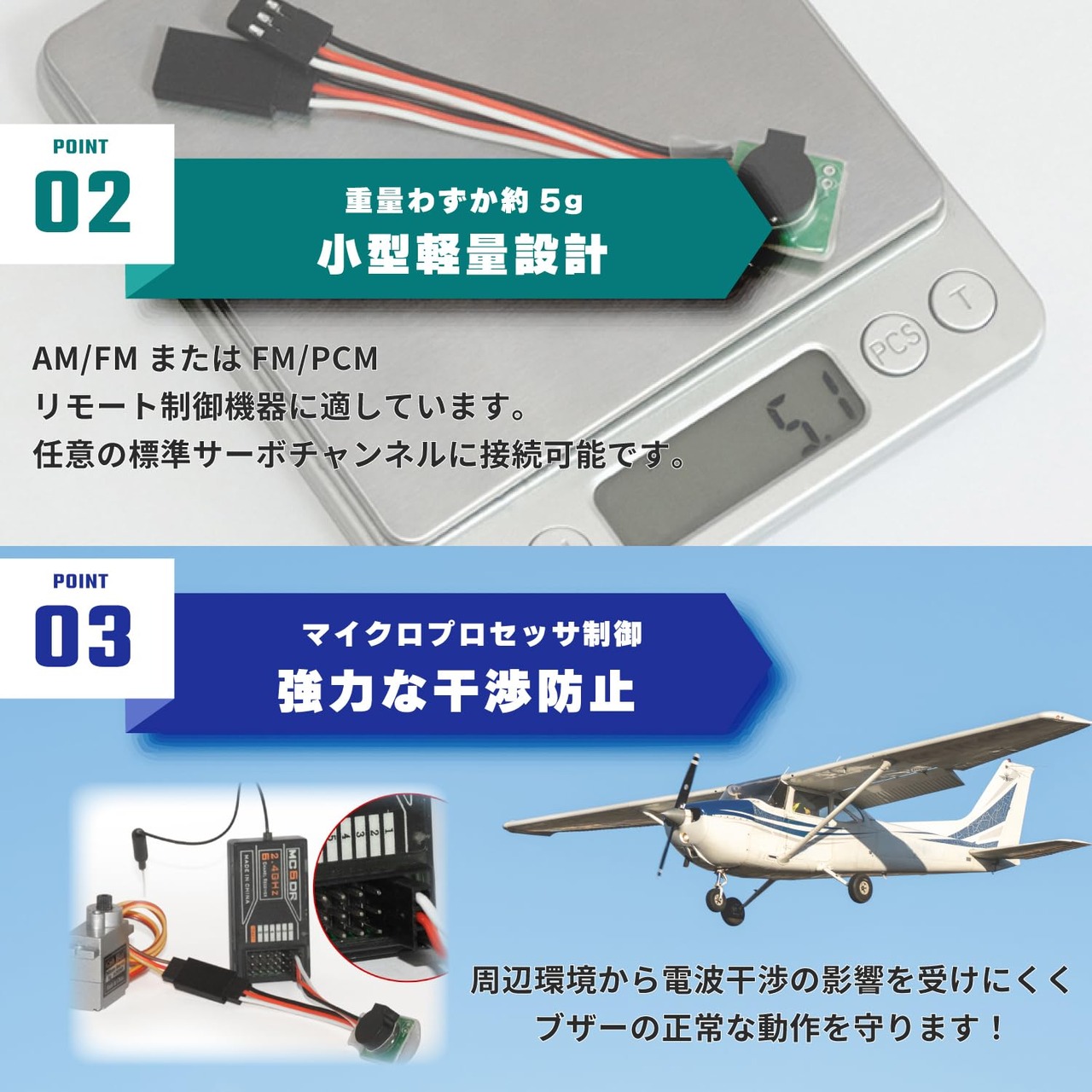 ラジコン用電子ブザー3本セット(用途:飛行機/ヘリの紛失防止)/紛失防止を強力アシスト 飛行機/ヘリの冒険を安全に。高音量80dBで大音響。ラジコンの紛失心配を一掃。 【特長】小型軽量、AM/FM、FM/PCMリモート対応。多様な機器とシームレスに連携。独自のホイッスル音は周囲ノイズから浮き彫り。確実な紛失防止。 【革新的なテクノロジー】マイクロプロセッサ制御で強力な干渉防止。安定した通信で心地よい飛行をサポート。 【安全・確実な飛行への一歩】ラジコン愛好者に必須の優れたアクセサリー。ワクワクの飛行体験をお楽しみください。