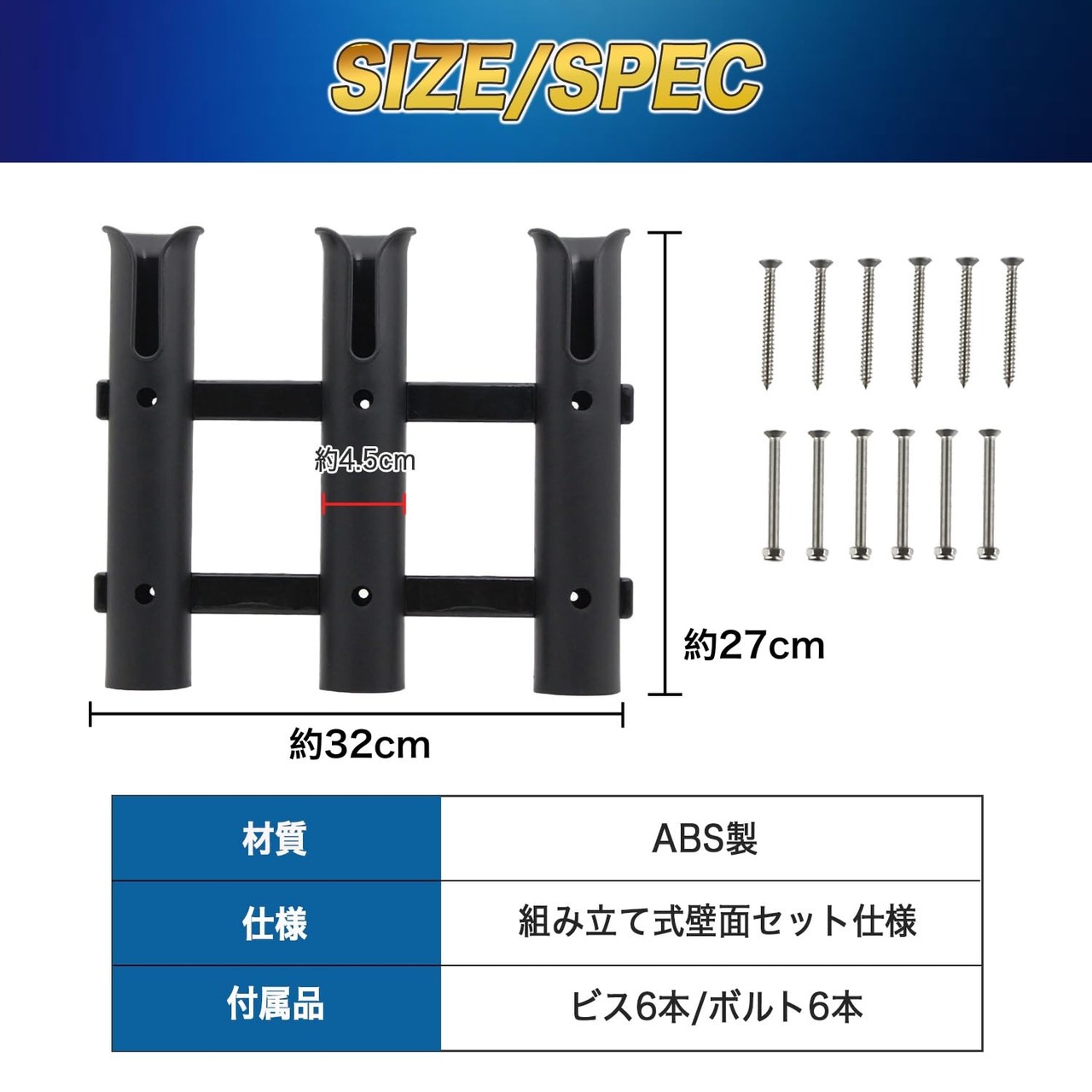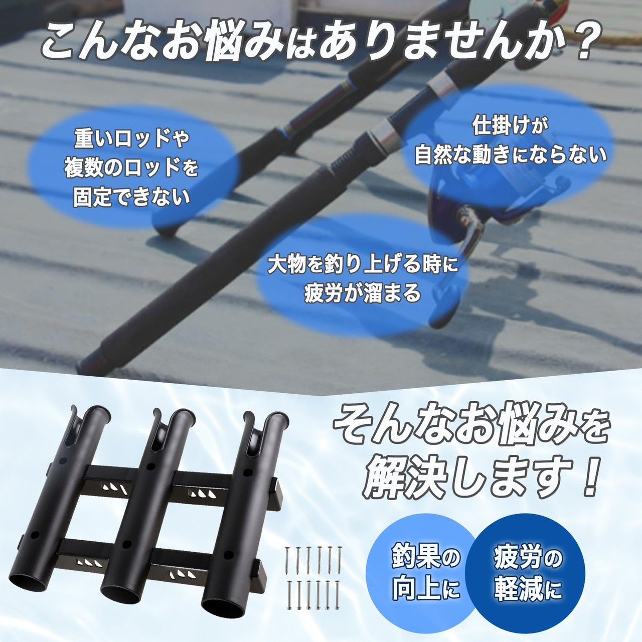【便利な3連ロッドホルダー】釣りで大活躍の3連ロッドホルダー!複数のロッド管理にオススメです。組立て式壁面セットタイプなので、工夫次第でランディングネットのホルダーとしても使用可能。ロッドホルダーのフレーム部分には、ナイフやハサミなどの収納用の穴やルアーフックをかける穴もある多機能な釣竿スタンドです。