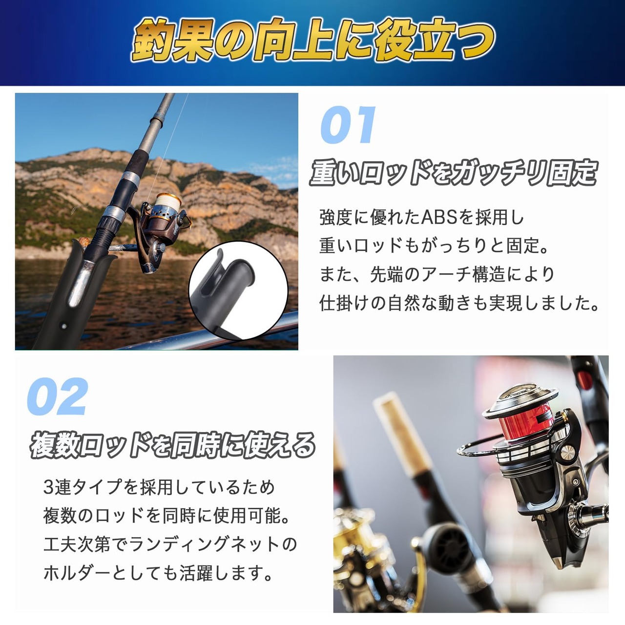 【便利な3連ロッドホルダー】釣りで大活躍の3連ロッドホルダー!複数のロッド管理にオススメです。組立て式壁面セットタイプなので、工夫次第でランディングネットのホルダーとしても使用可能。ロッドホルダーのフレーム部分には、ナイフやハサミなどの収納用の穴やルアーフックをかける穴もある多機能な釣竿スタンドです。 【自由にカスタマイズ】組立て式壁面セットタイプなので、場所を選ばずネジで簡単に取り付けられます。工夫次第でランディングネットのホルダーとしても使用可能。重量のあるクーラーボックスや各プレジャーボート、船、ボート、カヌー、カヤック、カヌーフィッシングのロッド管理に最適。自分好みのカスタムやお手持ちの釣具に合わせて自由にお使いいただけます。 【頑丈で万能で劣化しにくい】ABS樹脂(プラスチック)素材で作られているので、頑丈で壊れにくく軽量で耐候性があり永久に錆ません。ショアジギングやソルトライトジギングなど川や湖での釣りはもちろん、海釣りで青物など大物を釣るためなどにも万能にお使いいただけます。 【サイズ】約32cm×約27cm×約4.5cm、【重量】約620g、【バリエーション】1個(単品)と2個セットの2種類よりお選びいただけます。