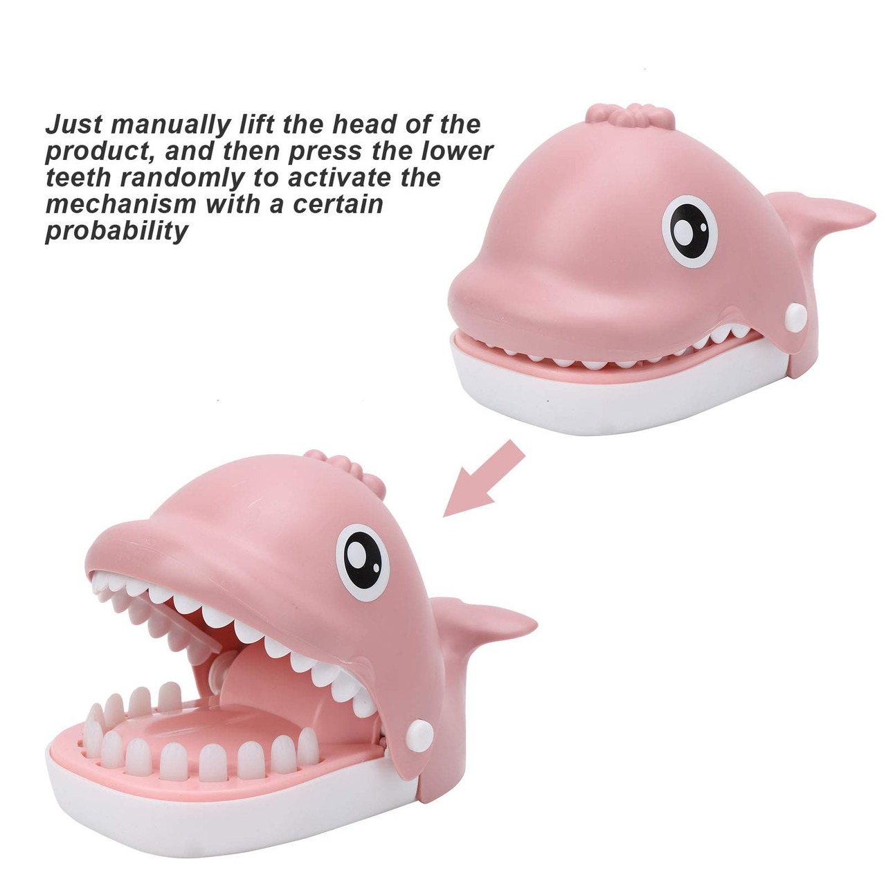遊びも操作も簡単:おもちゃの頭を持ち上げて下の歯を押すだけで、噛みつき機構が作動します。一定の確率でおもちゃが動作し、ゲームに驚きの要素を加えます。