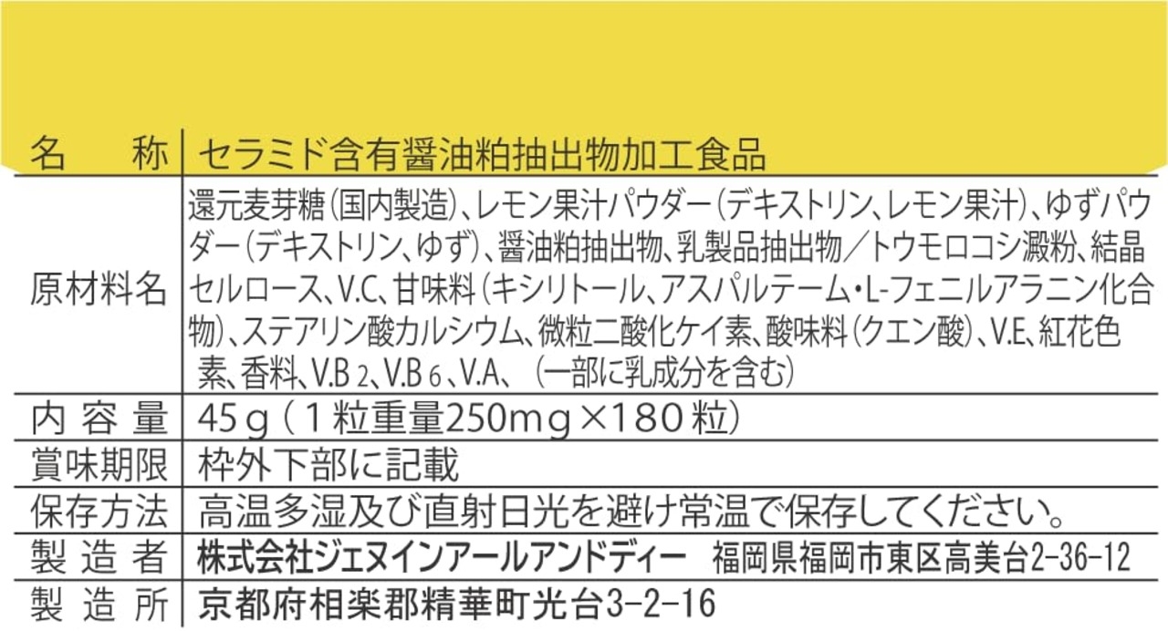 原材料名 還元麦芽糖(国内製造)、レモン果汁パウダー(デキストリン、レモン果汁)、ゆずパウダー(デキストリン、ゆず)、醤油粕抽出物、乳製品抽出物/トウモロコシ澱粉、 結晶セルロース、V.C、甘味料(キシリトール、アスパルテーム・L-フェニルアラニン化合物)、ステアリン酸カルシウム、微粒二酸化ケイ素、酸味料(クエン酸)、V.E、 紅花色素、香料、V.B2、V.B6、V.A、(一部に乳成分を含む)
