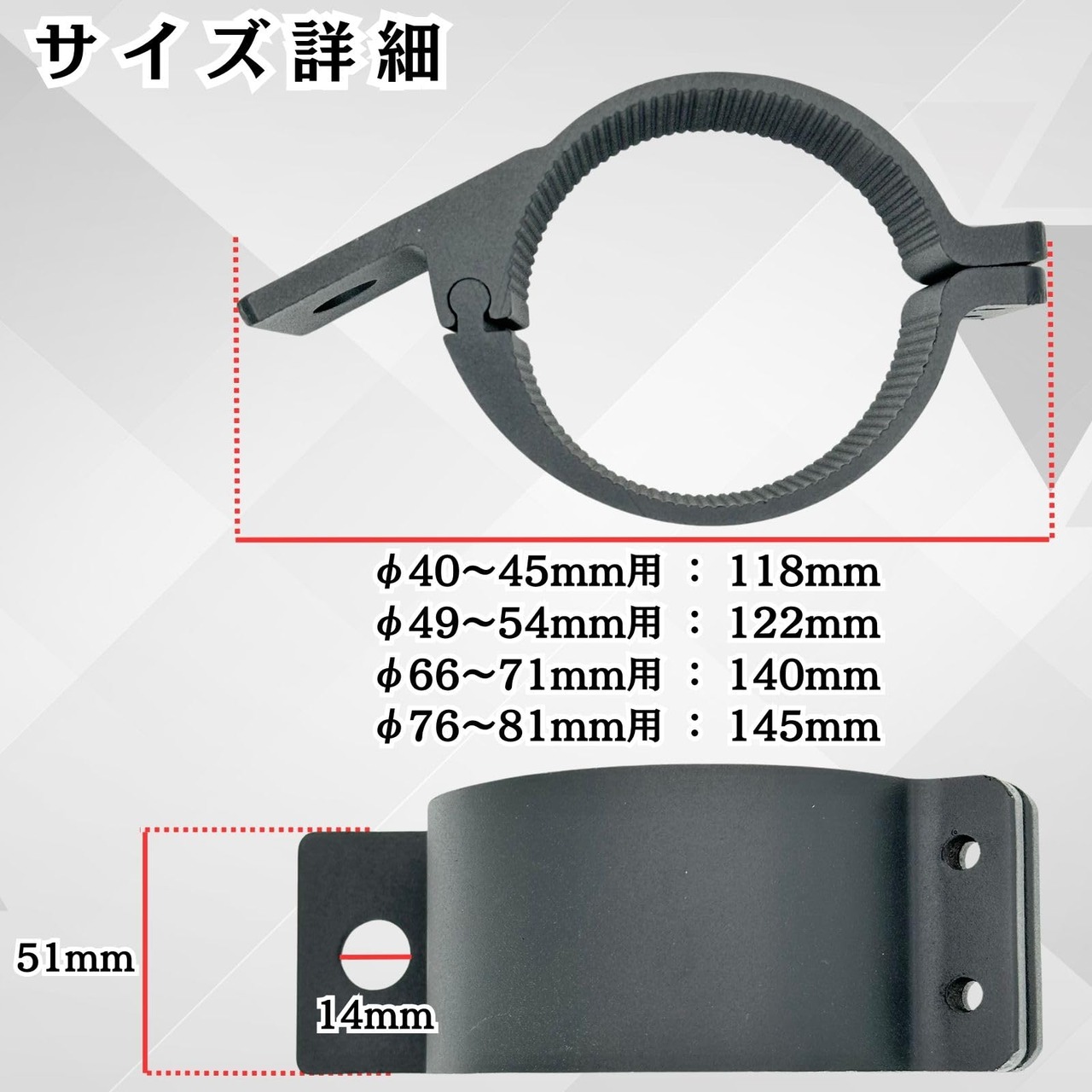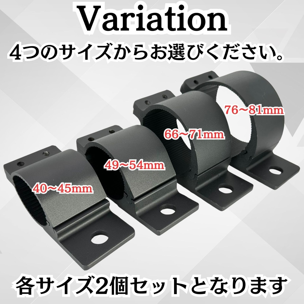 取付径のサイズはφ40〜45mm、φ49〜54mm、Φ66~71mm、φ76~81mmの4種類ございます。取付箇所のサイズに合わせてお選びください。