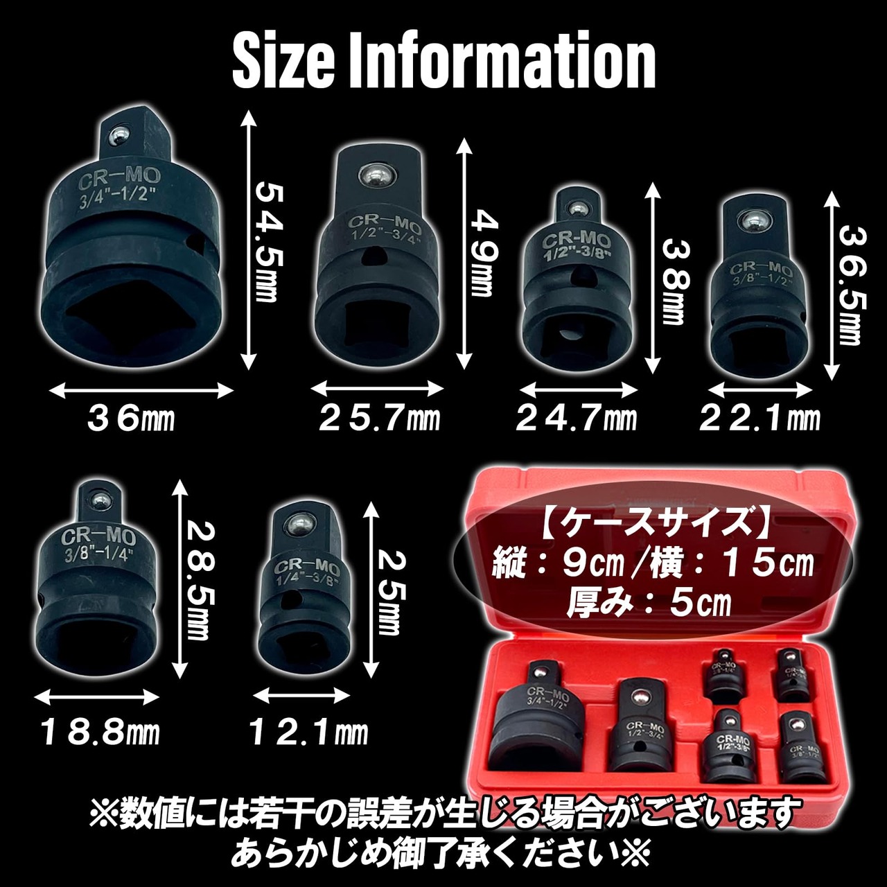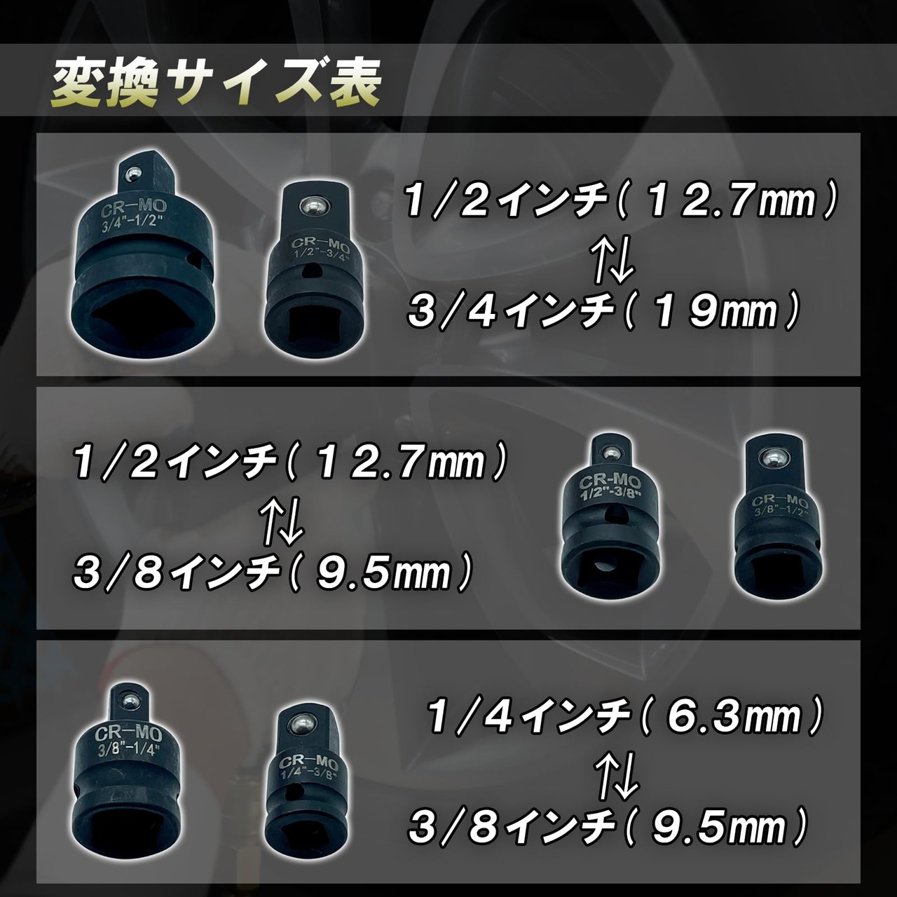 ✅【商品内容】インパクトレンチ対応の差込角の変換が可能なソケット変換アダプター6点セットになります。 ✅【簡単な操作性】エアーインパクトレンチや電動インパクトレンチに装着するだけで、簡単に差込角のサイズを変換できます。 ✅【素材・品質】高品質なクロムバナジウム鋼を採用しており、耐久性や耐摩耗性に優れてるので、安心してお使いいただけます。 ✅【付属品】収納や運搬に便利なプラスチックボックス付きで、紛失の心配もございません。 ✅【変換サイズ】1/4インチ(6.3mm)⇔3/8(9.5mm)、3/8(9.5mm)⇔1/2(12.7mm)、1/2(12.7mm)⇔3/4(19mm)