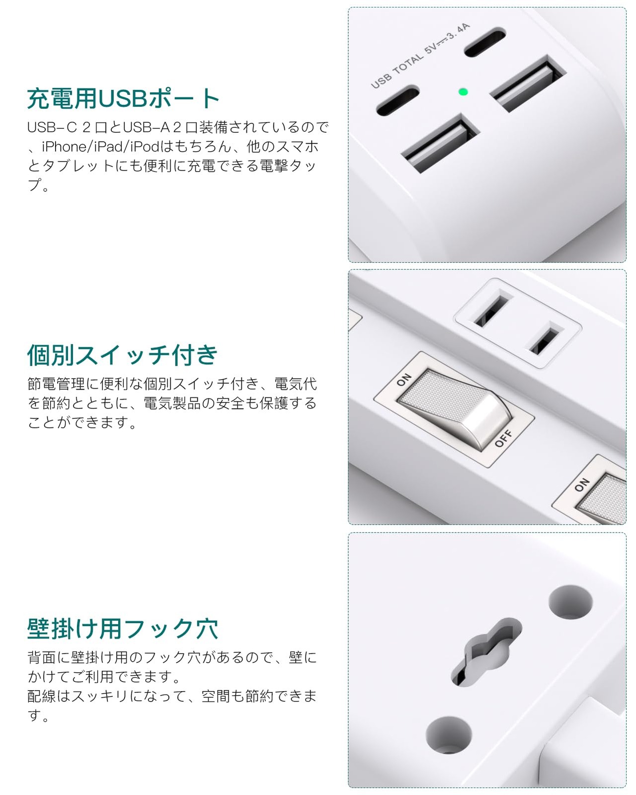 【壁掛け用·卓上に&5mケーブル】コンセントタップは壁等に仮固定できるフック穴付き、壁にかけてご利用できます。省スペースで、配線もスッキリになります。テーブルタップの底の四角にゴム製の滑り止めがついており、卓上で安定感があります。両立な使い方あり、お客様に心地よい生活を与えます。使い勝手のいい5mケーブルを採用し、コンセントから少し離れた場所でも利用できます。家庭、オフィス、会議室、パーティーなどにも大活用できます。