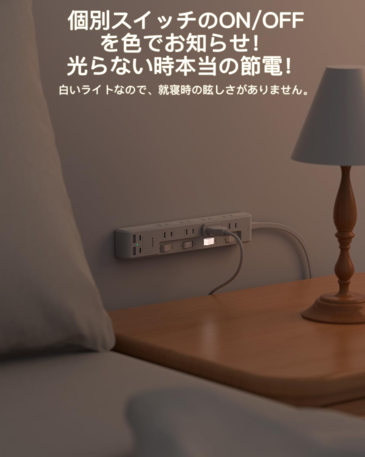 【節電スイッチ付き&干渉しづらいデザイン】コンセントには接続機器のON/OFFができるスイッチが付いており、使わないところは切って電力を節約することができます。スイッチLEDランプが付いており、一目で通電が見えて安心です。また目に優しい白い光なので、就寝の時眩しく感じることがないです。(※ご注意各スイッチは上下2つのAC差込口を制御します。)ACコンセントを2方向に分配して、どちら側からも気軽にケーブルを挿すことができます。また、180°スイングプラグを採用して、狭い場所でも配線しやすい。本製品は日本の電圧(100~125V)に合わせて設計されるので、日本国内のみ使用できます。