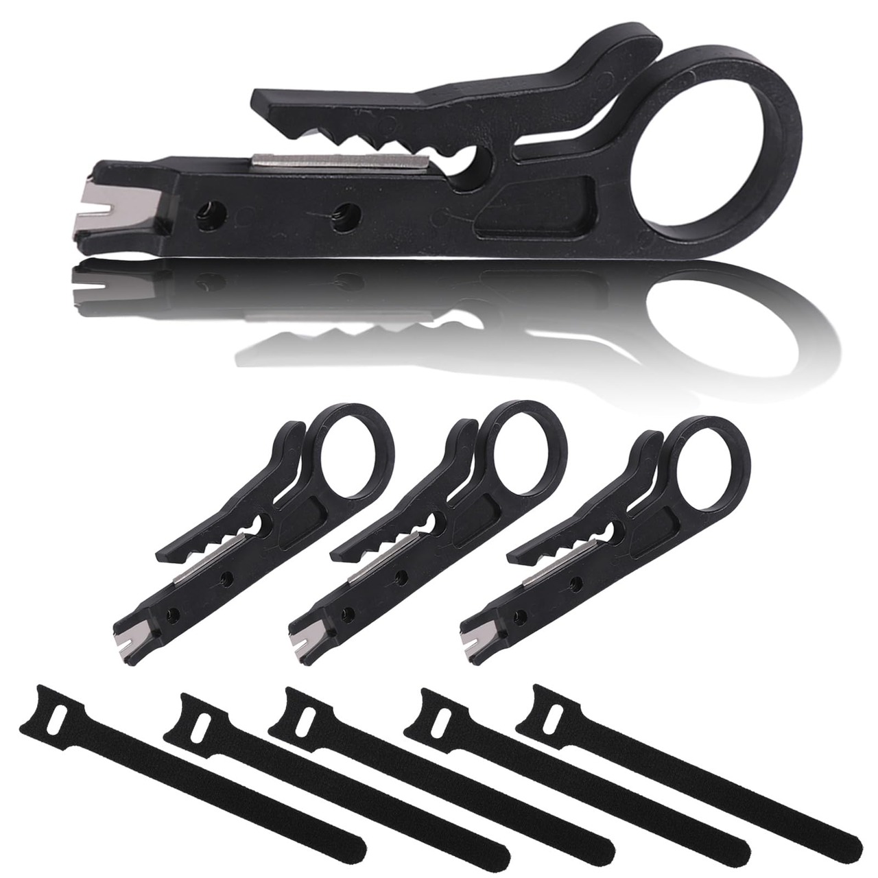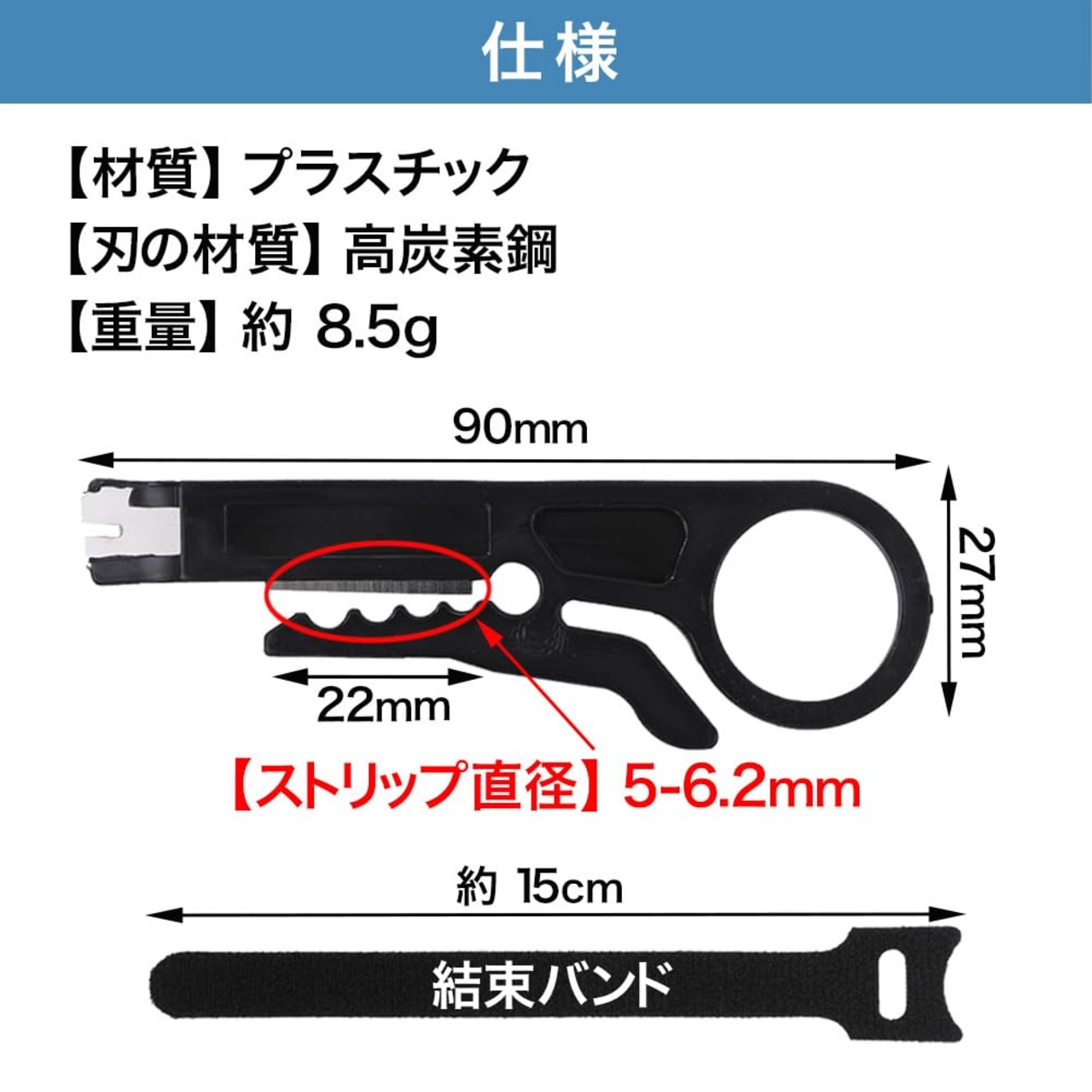 【サイズ】約 90 × 27 mm 【刃幅】約 22 mm 【ストリップ直径】5 - 6.2 mm 【厚さ】 約 2 mm 【重量】約 8.5 g 【材質】プラスチック 【刃の材質】高炭素鋼 【色】グレー 【セット内容】4個セット・長さ約15cmの結束バンド5本付き