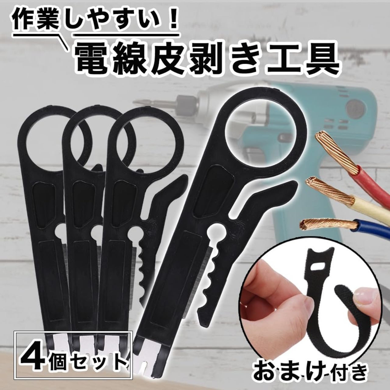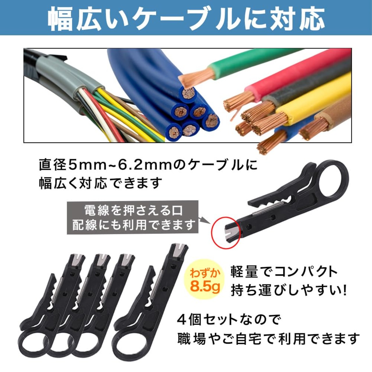 LANケーブル等の皮剥き工具4個セットです。<br> 簡単に皮剥きができる鋭利な刃と使い勝手の良いデザインで、小さくてもしっかりと仕事ができる品です。<br> ストリップ直径5〜6.2 mmの大きさの穴が空いているので、各種サイズの配線にご利用いただけます。数回回転することで皮膜を剥がすことができます。(何度も回すと内側のケーブルを切ってしまう恐れがありますのでお気を付け下さい。)<br> 4個セットで、持ち運びにも便利な軽量コンパクトサイズなので業務用に最適です。また、ご家庭の常備工具としてもいかがでしょうか?<br> <b>商品仕様</b> 【サイズ】約 90 × 27 mm 【刃幅】約 22 mm 【ストリップ直径】5 - 6.2 mm 【厚さ】 約 2 mm 【重量】約 8.5 g 【材質】プラスチック 【刃の材質】高炭素鋼 【色】グレー 【セット内容】4個セット・長さ約15cmの結束バンド5本付き