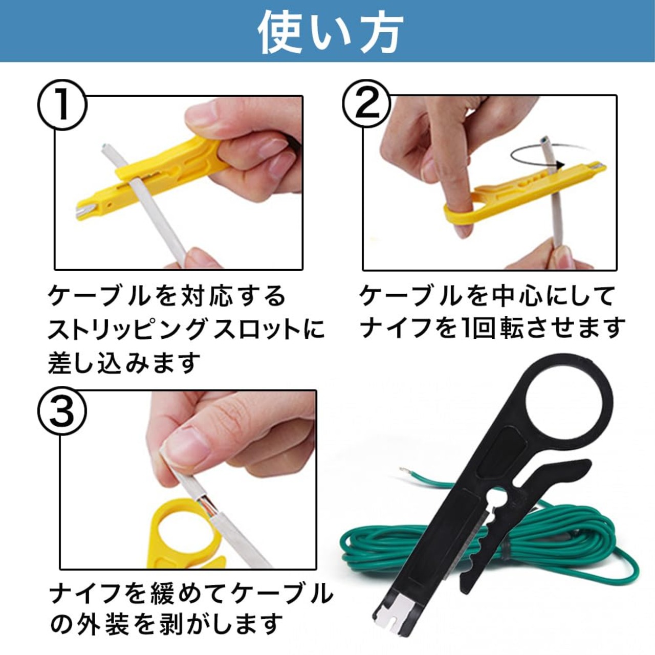 ストリップ直径5〜6.2 mmの大きさの穴が空いているので、各種サイズの配線にご利用いただけます。数回回転することで皮膜を剥がすことができます。(何度も回すと内側のケーブルを切ってしまう恐れがありますのでお気を付け下さい。)