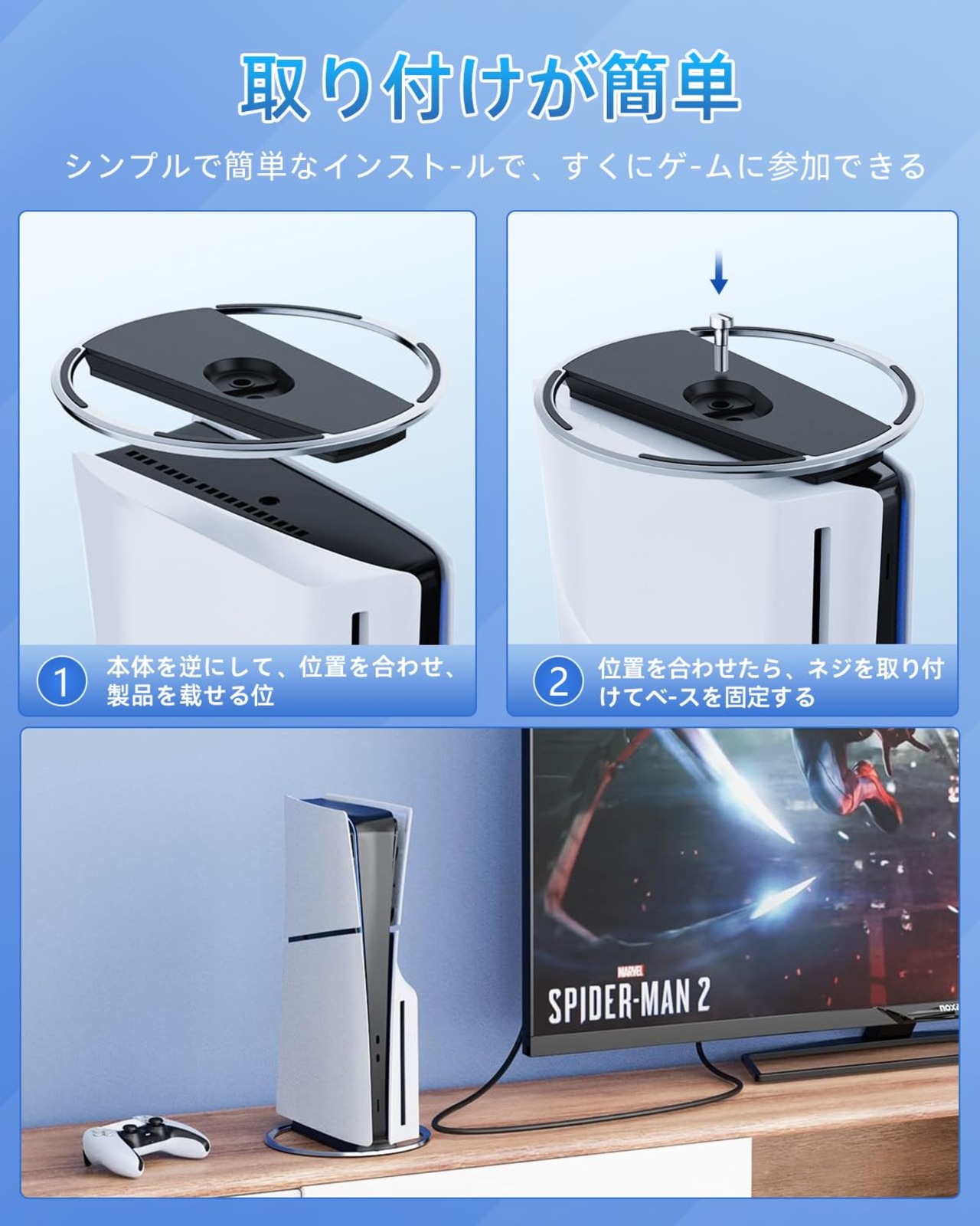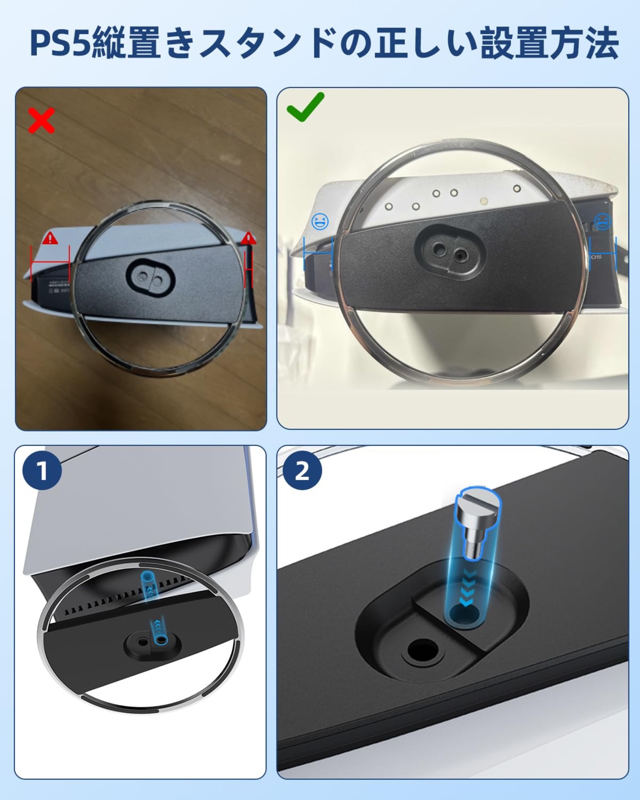 PS5 Slim/PS5/PS5 Pro縦置きスタンド,For PlayStation 5 専用,転倒防止 地震対策 傷付き防止 放熱改善,PS5 スタンド,PS5 縦置きスタンド,PS5 Slim スタンド,PS5 Pro対応 PS5 周辺機器 【PS5/PS5 Slim/PS5 Proスタンド】PS5 Slim Disc&Digital / PS5 Disc&Digital / PS5 Pro用の縦型ドックスタンドです。底面には滑り止めのシリコンリング、本体固定用のネジが付属。これにより、PS5コンソールへの意外なぶつかりによる落下を防止し、コンソールを安定した位置に維持します。 【ミニマルなスタンド、省スペース】コンパクトで縦置きスタンドとして狭い場所でもPS5本体を設置できます。プレステ5スタンド洗練されたモダンなデザインを誇ります。PS5 Slim、PS5 Proの美しさを補完し、ゲームセットアップ全体の視覚的な魅力を高めます。 【高品質の素材を使用】PS5コンソールアクセサリーは高品質の素材で丁寧に設計されています。 センターベースは高硬度ABS複合樹脂を採用し、は耐腐食性、耐熱性、放熱性に優れ、無臭です。リングは高炭素合金ステンレス鋼リングを採用し、硬くて耐磨耗性に優れ、表面は滑らかで美しいです。 【放熱改善、取り付け簡単】縦型ベーススタンドはPS5コンソールから発生する熱をより効果的に放熱します、空気循環を促進することで。高品質のABSは放熱性に優れ、ゲーム機の放熱機能を最適化し、長時間のゲーム中に最高のパフォーマンスを発揮し、ゲーム機の寿命を延ばすパフォーマンスエンハンサーでもあります。取り付けはPS5本体とスタンドの形状を合わせ、固定用ネジを固定するだけのカンタン取り付け! 【サービス内容】2つのベーススタンドがあり、小さい方はPS5ディスク&デジタルに対応します、大きい方はPS5 Slimディスク&デジタルおよびPS5 Proに対応します。頑丈なネジと素晴らしいアフターサービスを提供します。商品について何かご質問がございましたら、お気軽にメールでお問い合わせください。