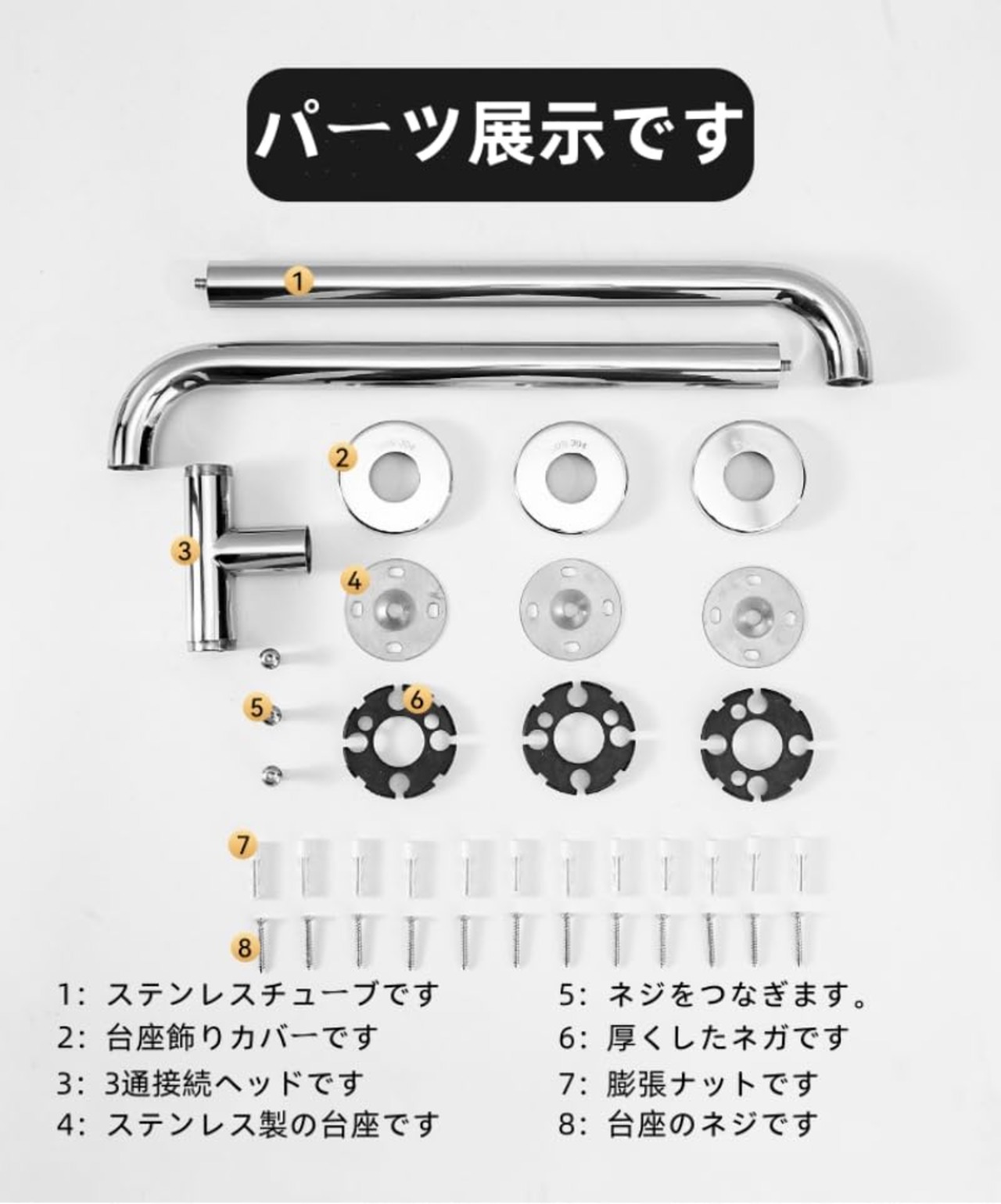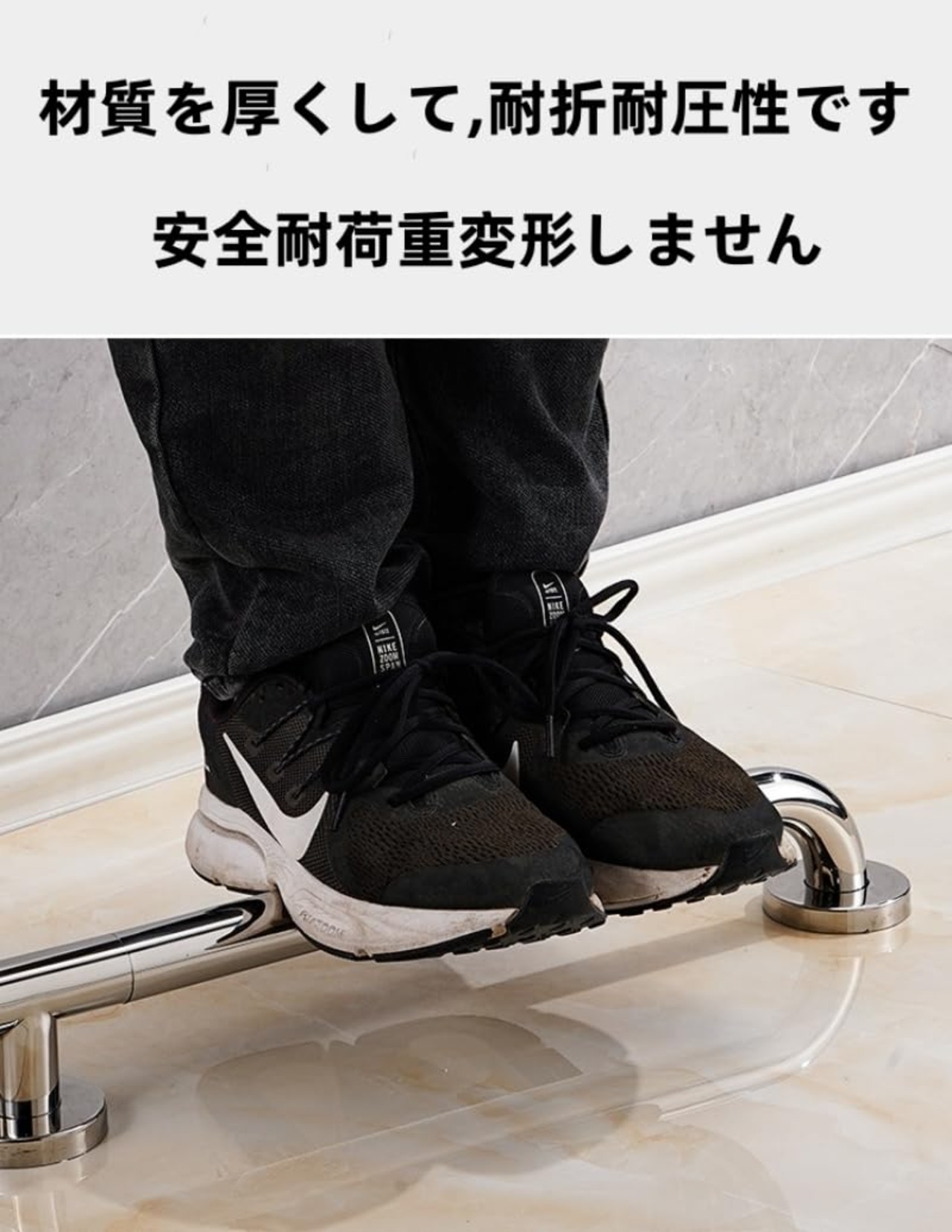 荷重:壁肉厚めたステンレスパイプとネジ止めの仕様を採用し、通常のステンレス製品よりも荷重が60%も大きくなりました。玄関、トイレ、浴室、お風呂様々なところにご安心に使えます。