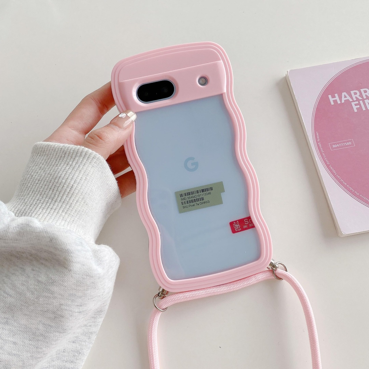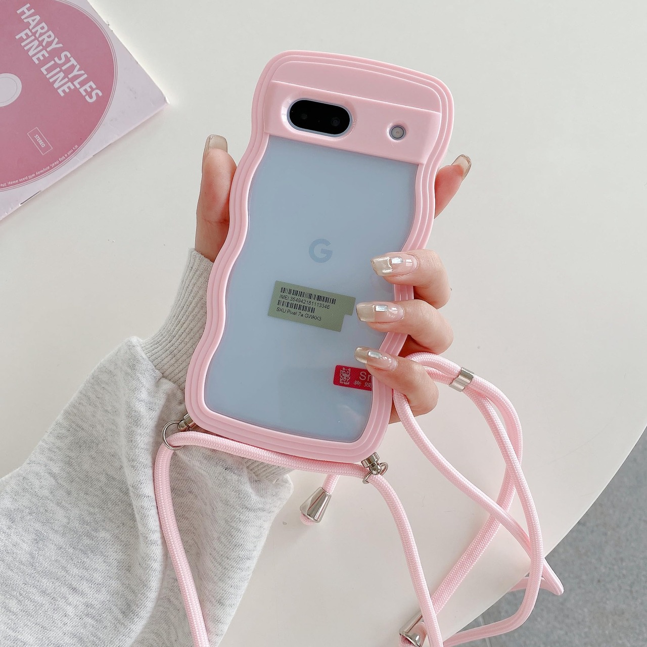 HILEGENER Pixel 7A かわいい クリアケース 波状フレームクリア ストラップ ショルダー 耐衝撃 グーグル ピクセル7A 6.1インチカバー 肩掛け 斜めかけ 縄掛けケース【長さ調整可能ピンク縄掛け付き】ウェーブ デザイン スマホカバー 韓国 可愛い 女子向け 人気 落下防止 紐付き 織りスト ネックストラップ ショルダー (Pixel 7A-ピンク)
