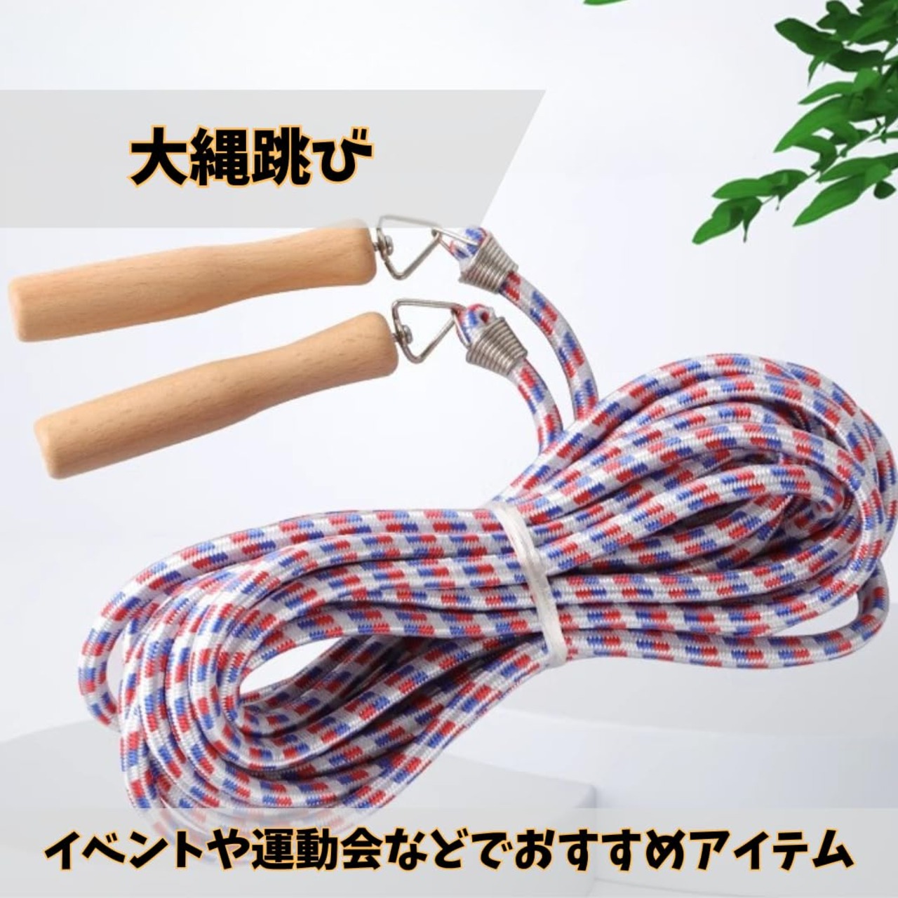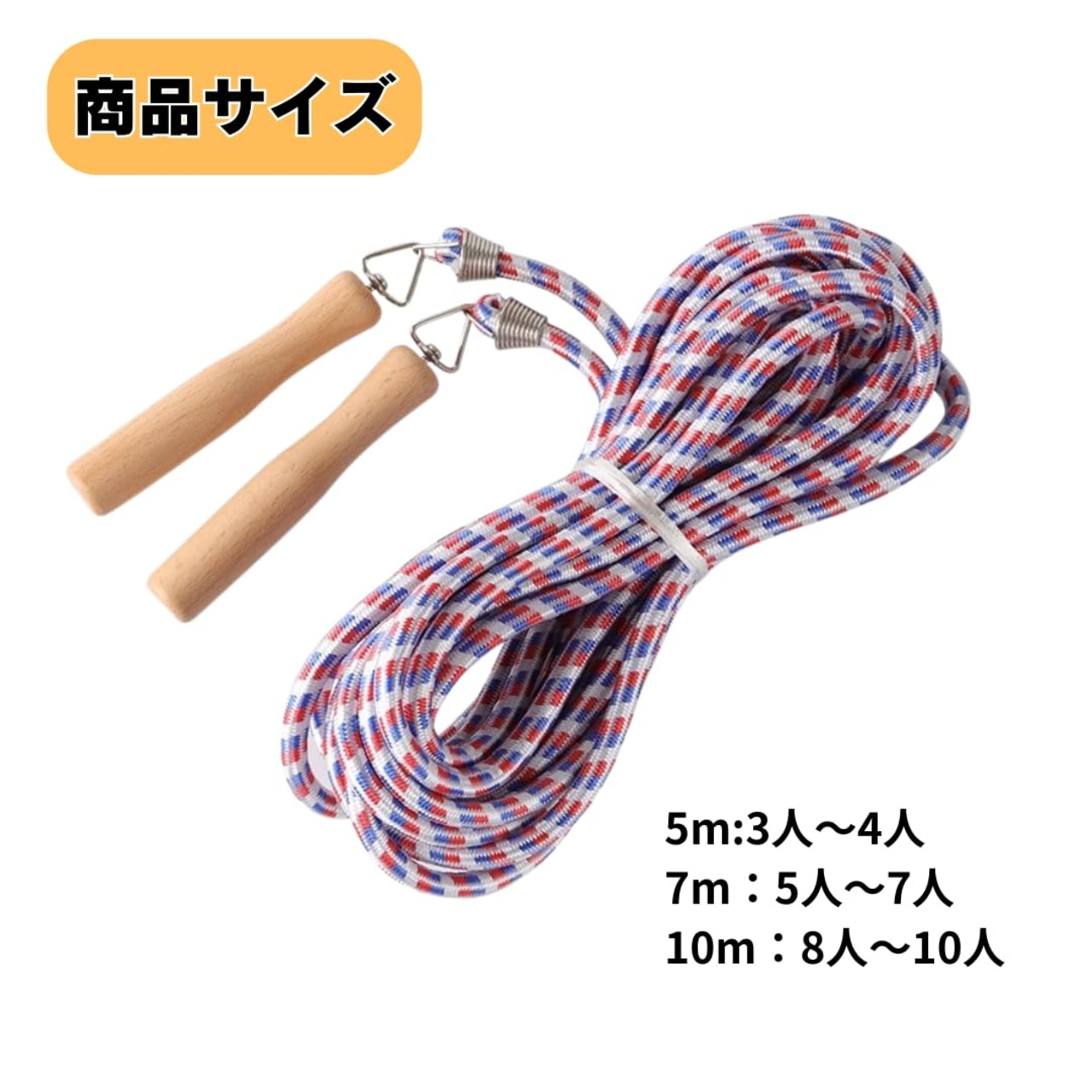 【幅広い用途】小学校のイベントやクラブ活動など子供の練習用として幅広く使用されています。また最近では家庭のお庭で遊ぶこともあり家庭のコミュニケーションの一環として用いられることもあります。 【木製グリップ】手で持つグリップは木製となっており持ち心地が良く痛くなりづらい作りとなっています。また持ち手と縄が360°回転するので非常に回しやすくなっています。 【使用人数】大繩跳びの使用人数は5mは3-4人、7mは5-7人、10mは8-10人となります。目安人数となりますが体格などにより使用人数は変わることもありますのであくまでも目安としてご参考にしてください。