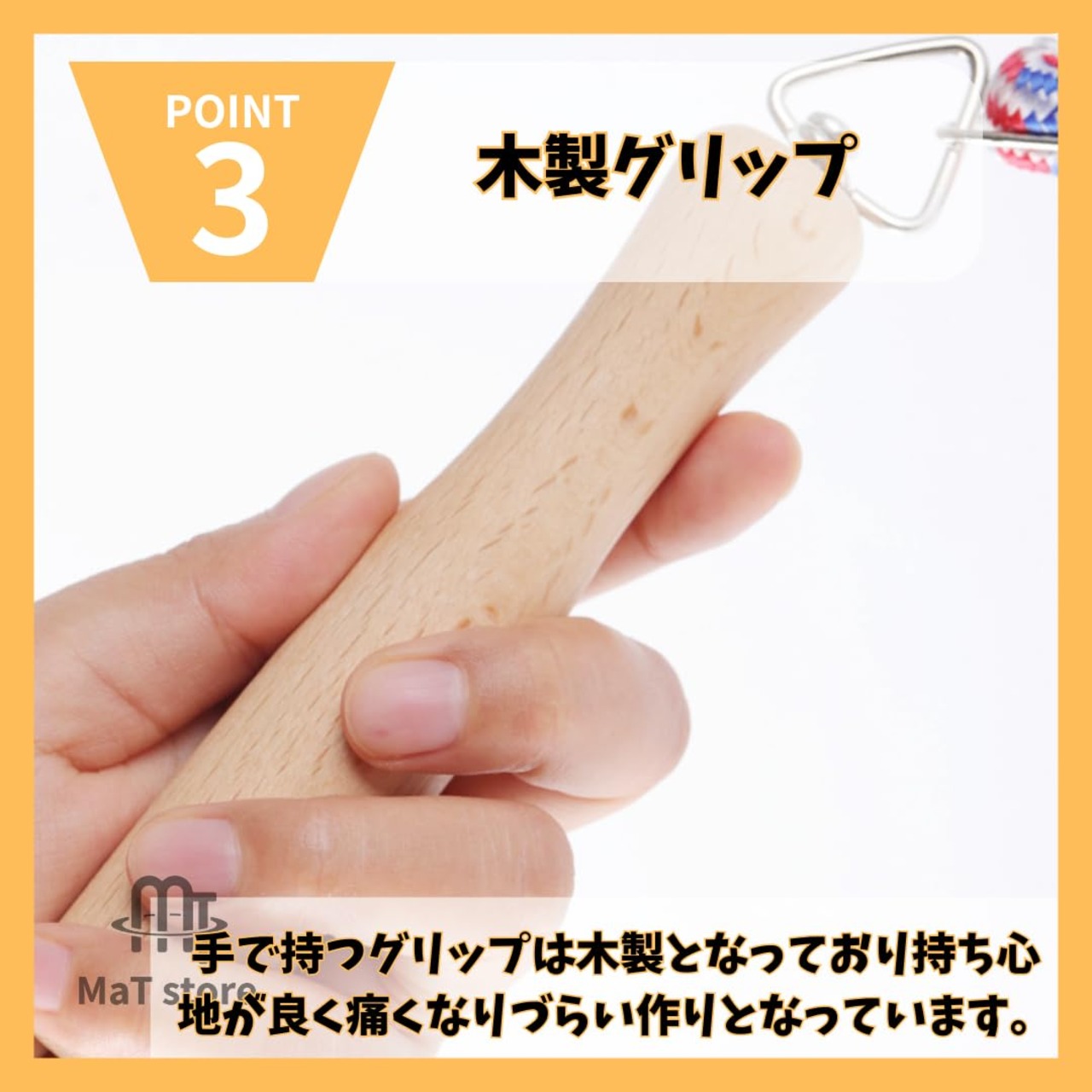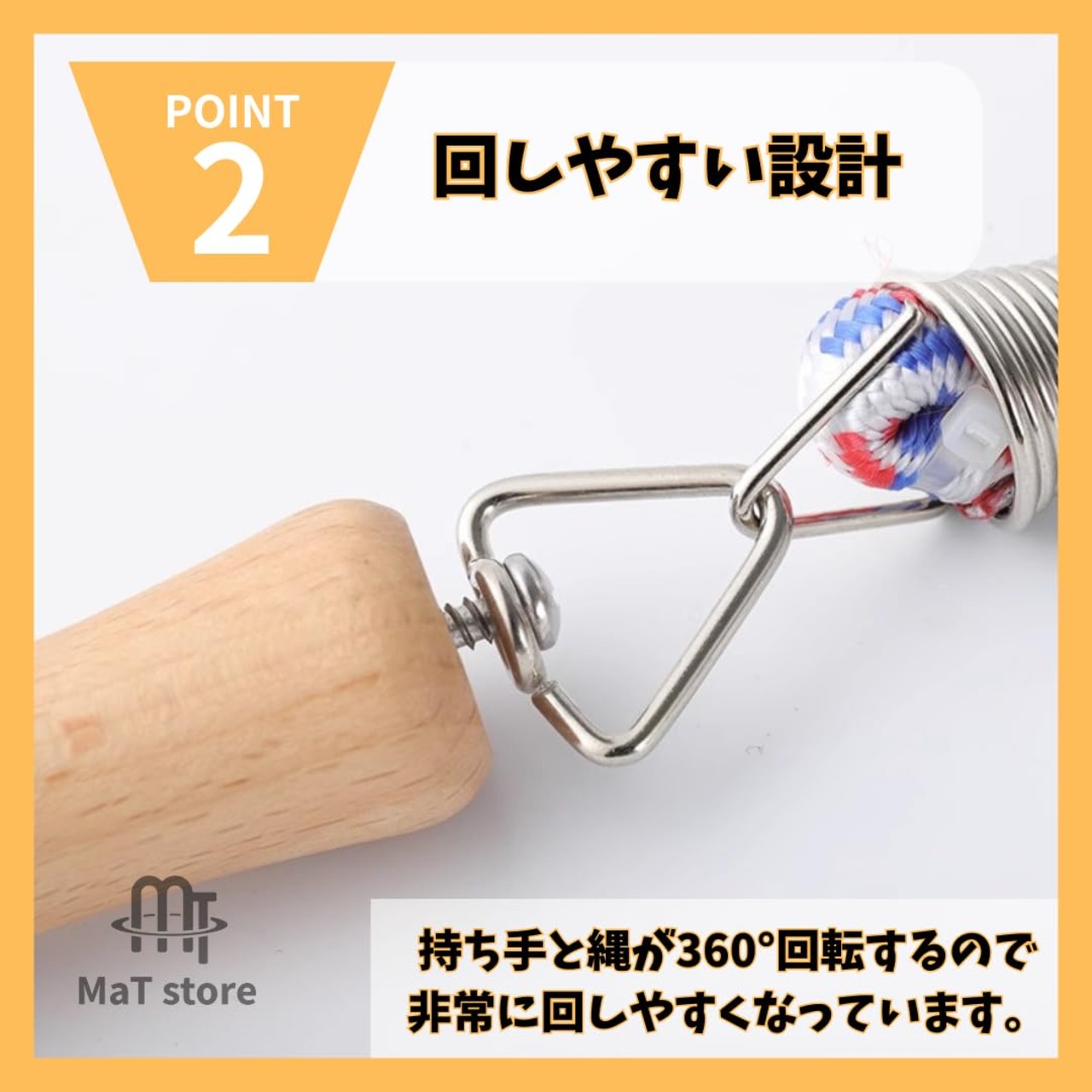 【木製グリップ】手で持つグリップは木製となっており持ち心地が良く痛くなりづらい作りとなっています。また持ち手と縄が360°回転するので非常に回しやすくなっています。