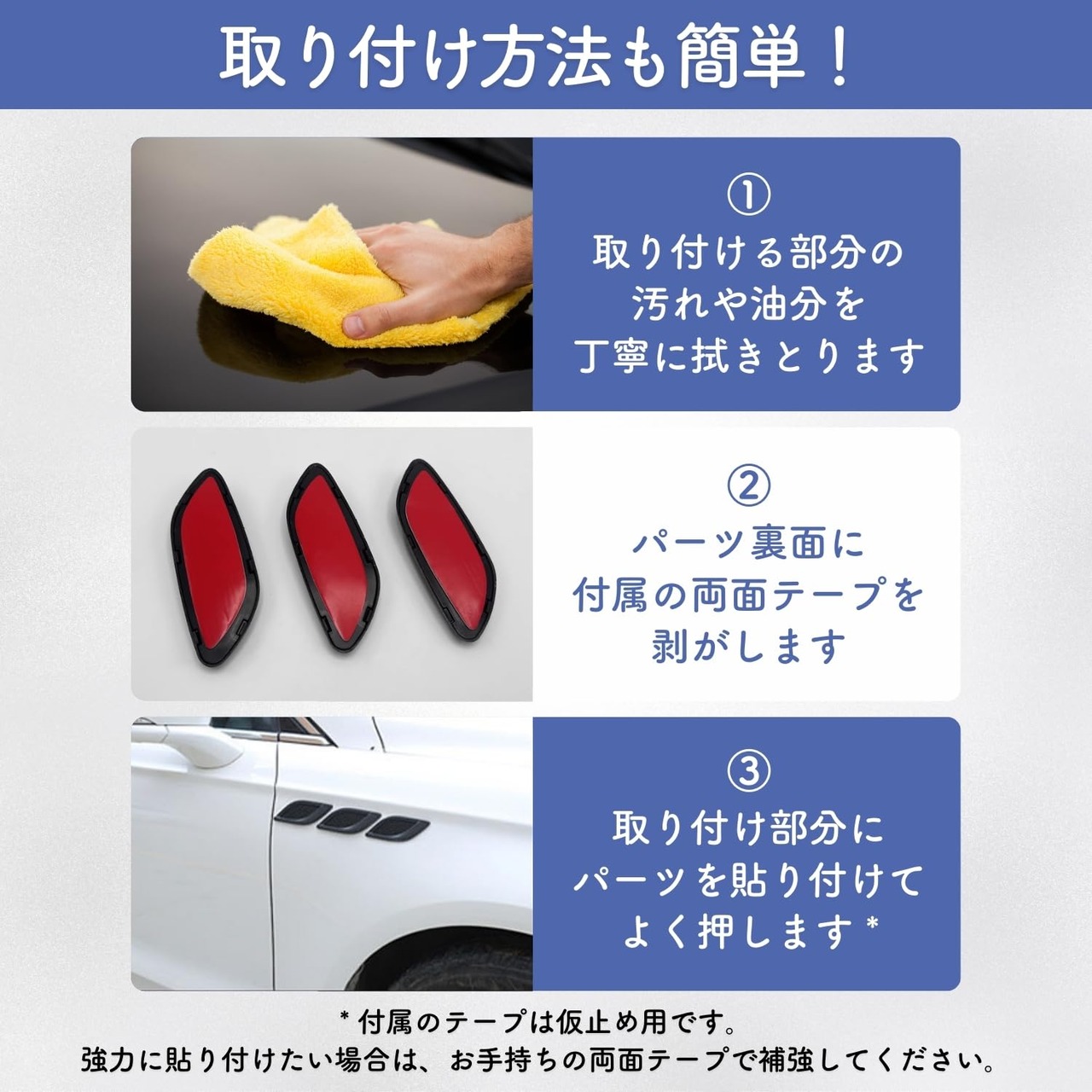 カラー:ブラック(黒)、カーボン調 入り数:6個(3個2セット) 付属:両面テープ付き 当商品の両面テープは仮止め用です。必ず脱脂して当両面テープで位置決めした後、お手持ちの強力両面テープでしっかりと固定してください。