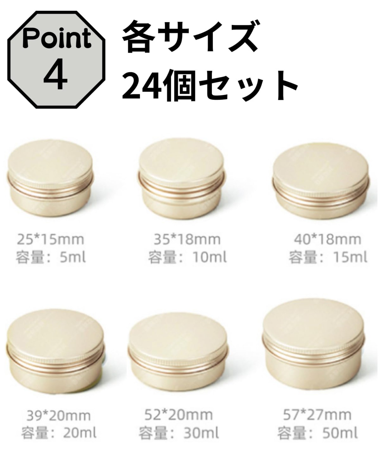 ✅【詰め替え用に】小物の保管や小分けに便利なアルミ缶です。クリームなど様々なものを小分けにできます。プレゼント用にも最適です。✅【らせん蓋でしっかり密封】 旅行や普段の持ち運びの際に役立ちます。蓋を時計周りに回すとしっかり密封しますので安心してカバンの中に入れて置くことが出来ます。✅【商品詳細】本体:24個、材質:アルミニウム、耐熱温度:100度は20分まで 120度は10分まで、容量:5ml,10ml,15ml,20ml,30ml