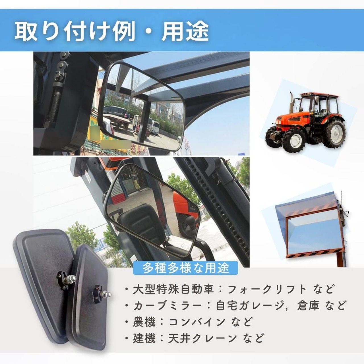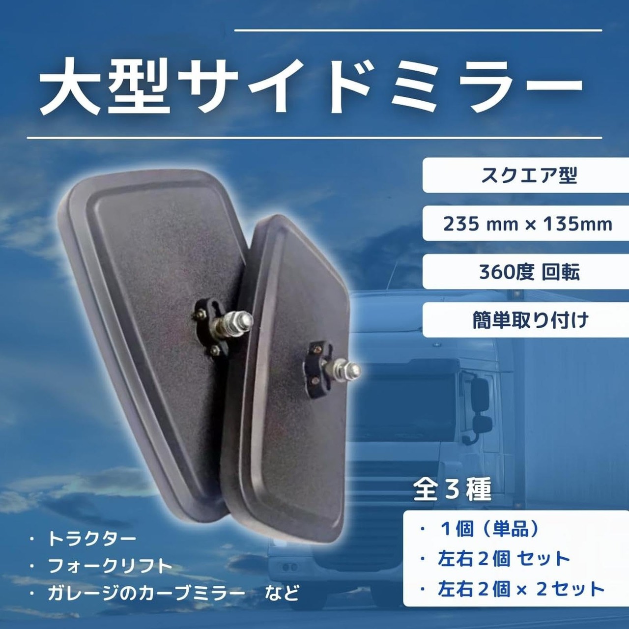 サイドミラー 大型 バックミラー カーブミラー 黒 スクエア型 角型 フォークリフト トラクター 重機 農機 建機 トラック 鏡 汎用 360度回転 単品 1個