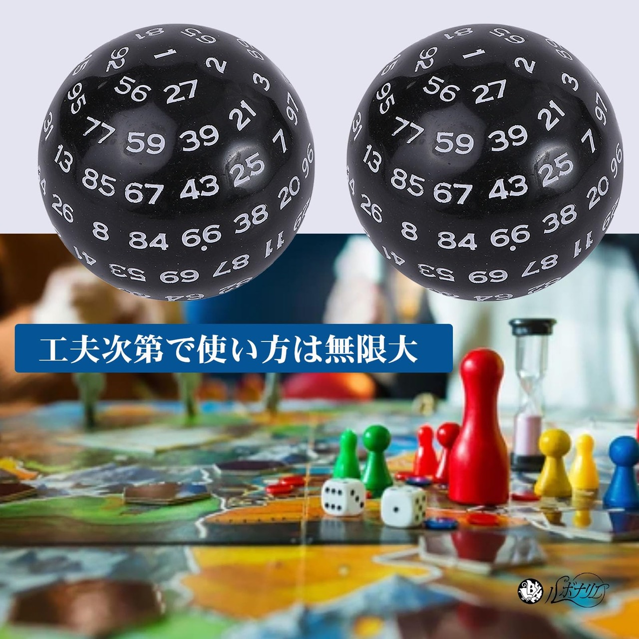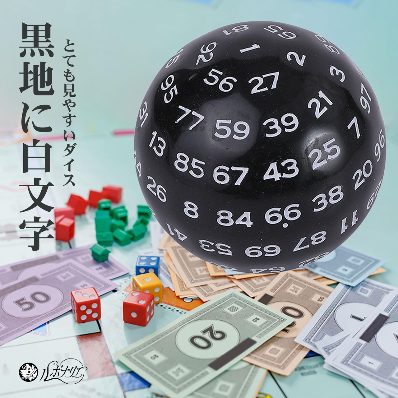 1から100までの目が揃った球体型の100面タイプのダイスです。黒地に白い文字ですので、とても見やすいダイスです。新年会やクリスマスパーティ、誕生会などでお使いいただくと盛り上がること請け合いのおもしろアイテムです。