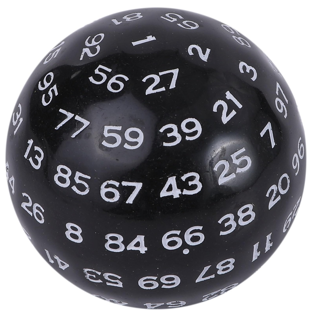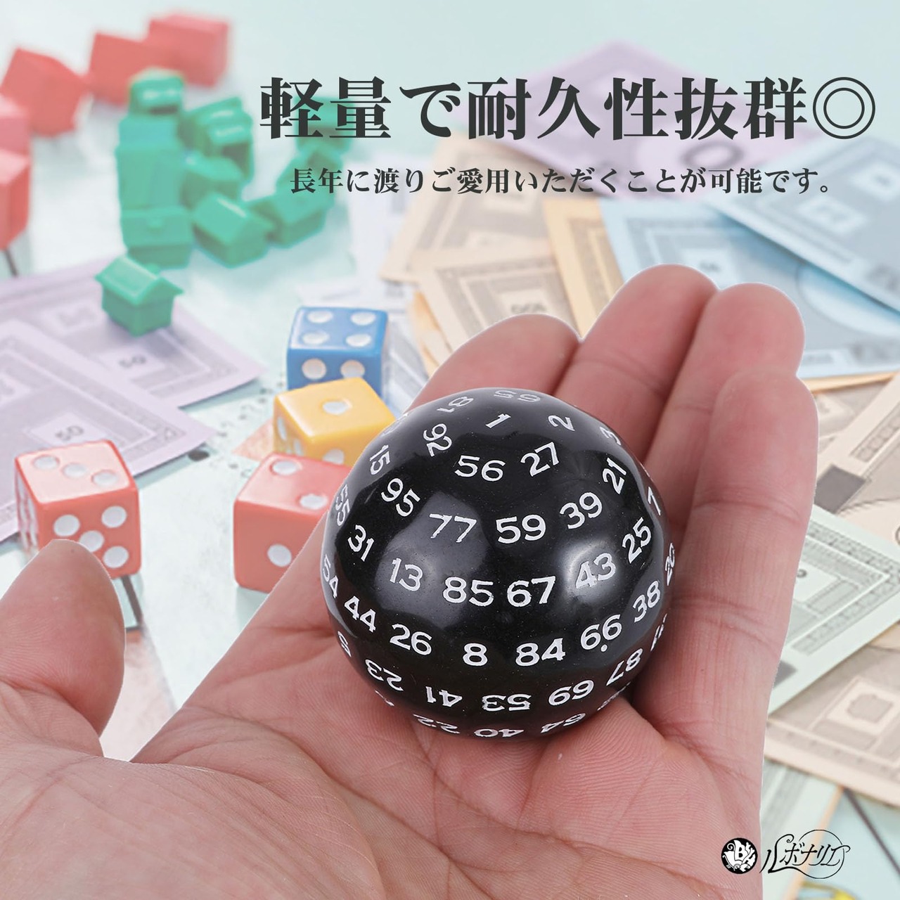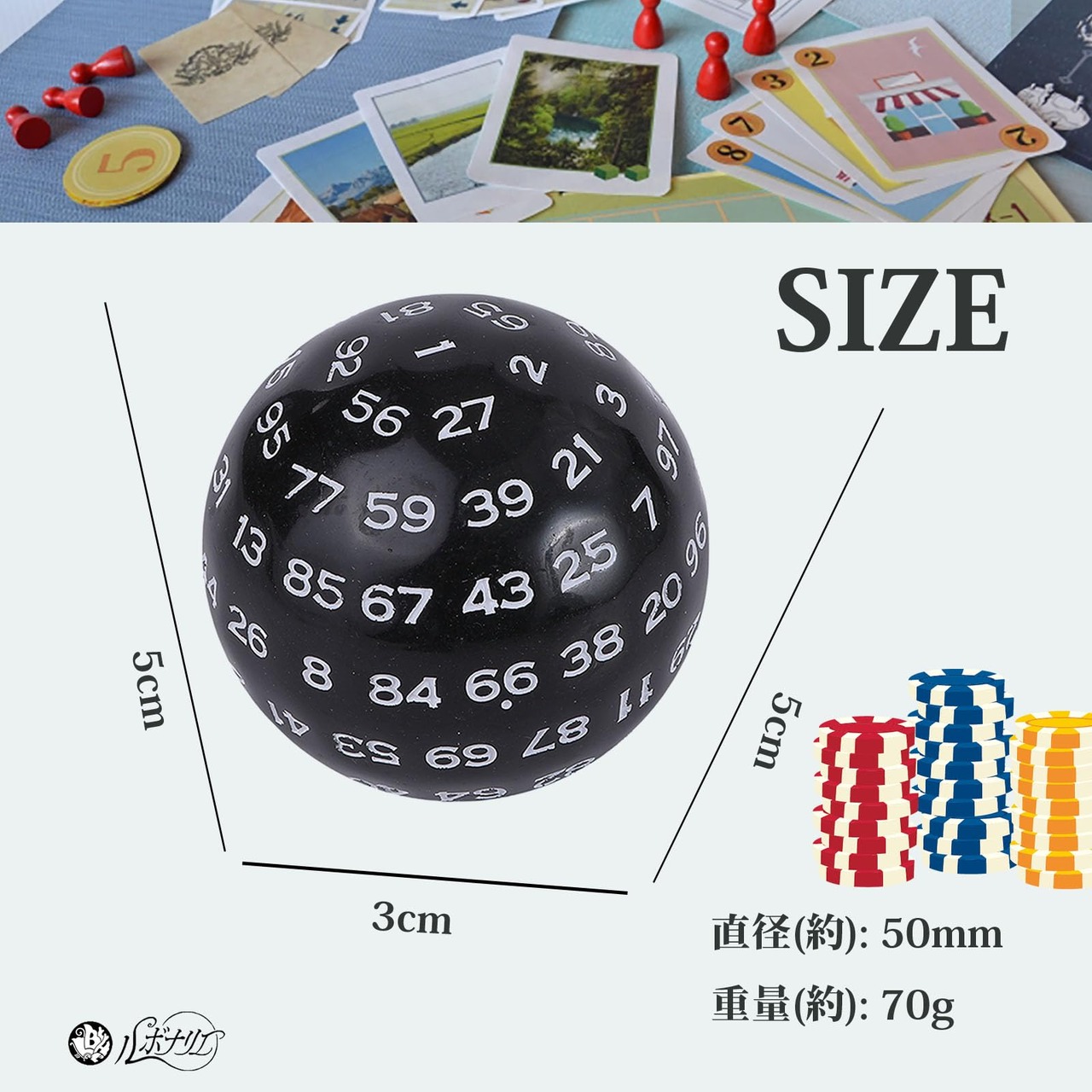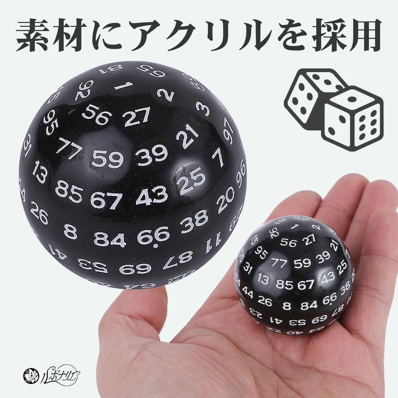 【100面ダイス 多面体 サイコロ 黒 白 ボードゲーム 100面多面体 マルチサイドダイス 多面アクリルサイコロ ダイス 50mm】<br><br>・1から100までの目が揃った球体型の100面タイプのダイスです。黒地に白い文字ですので、とても見やすいダイスです。新年会やクリスマスパーティ、誕生会などでお使いいただくと盛り上がること請け合いのおもしろアイテムです。<br>・素材にアクリルを採用しておりますので、軽量で耐久性に富んでおります。長年に渡りご愛用いただくことが可能です。<br>・一般的な6面タイプのダイスではなく、100面タイプのユニークなデザインとなっておりますので、新しいものや珍しいものがお好きな方へのプレゼントや開店のお祝いなどにもお使いいただけます。<br>・ボードゲームやロールプレイングゲームやビンゴなど様々なシーンでお使いいただけます。工夫次第で使い方は無限大です。<br><br>(仕様)<br>直径(約): 50mm<br>重量(約): 70g<br>文字カラー: ホワイト<br>※モニターの環境により、色の見え方に若干差が生じる場合があります。
