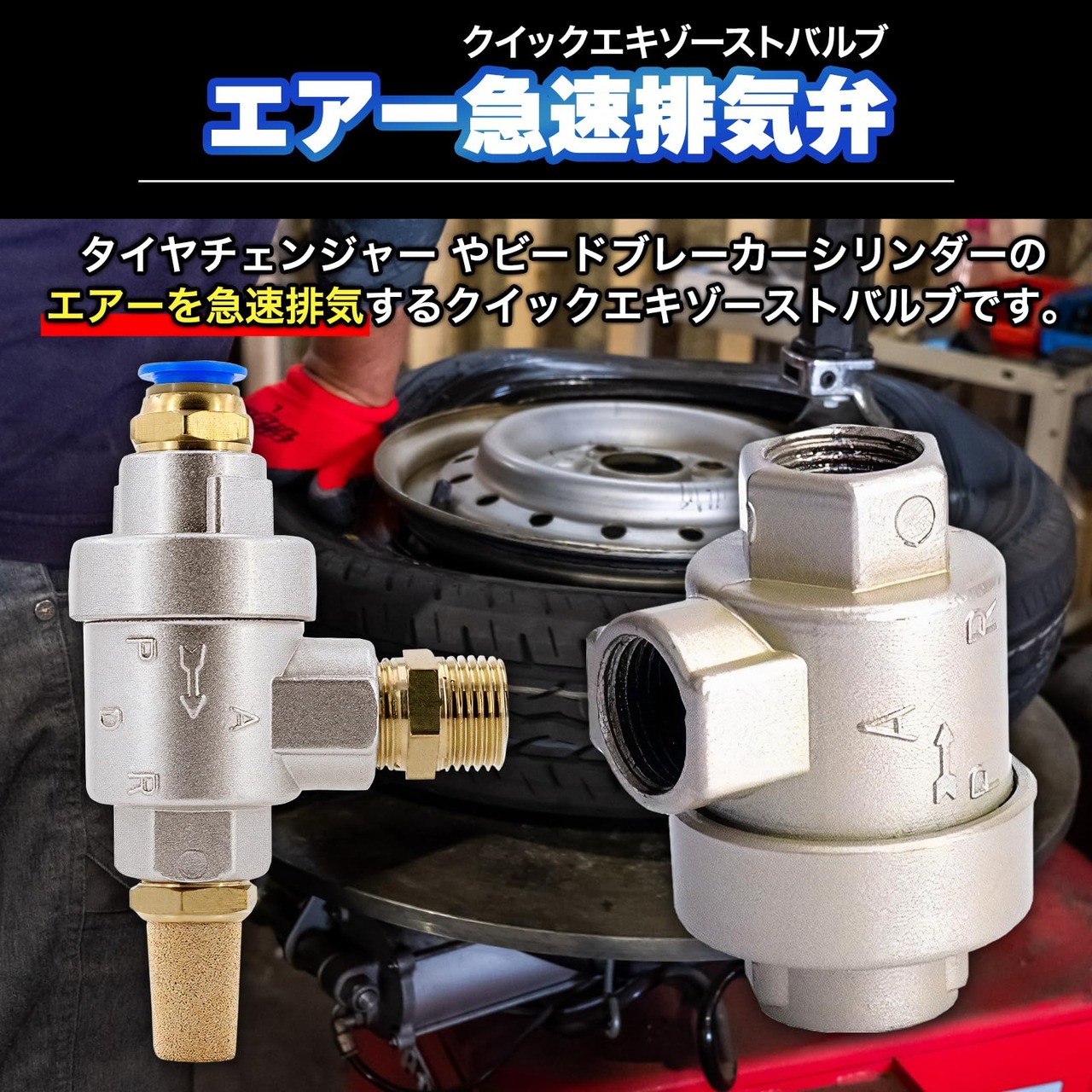 ✅タイヤチェンジャー やビードブレーカーシリンダーのエアーを急速排気するクイックエキゾーストバルブです。<br>✅本部品は、本体に樹脂製の弁を組み込んだ構造を持ちます。この構造により、急速にエアーを解放することが可能です。ビードブレーカシリンダーからのエアーを効率的かつ迅速にリリーフするため、機械的な弁の開閉を利用しています。<br>✅急速排気弁は丈夫な構造を持っていますが、消耗品のため使用する過程で劣化が起こる可能性があります。特に、連続的な作動や高圧のエアーにさらされることで、樹脂製の弁が劣化し、エアー漏れが発生することがあります。定期的な点検やメンテナンスが重要です。<br>✅急速排気弁が不調になると、シリンダーが正常に動作しなくなる可能性があります。例えば、シリンダーが戻らなくなったり、伸びなくなったりすることがあります。そのため、予備部品として急速排気弁を備えておくことが重要です。<br>✅【ねじサイズ】エアー入口G1/8(エアーチューブ径φ6)、エアー出口G1/8、エアー排気口(サイレンサー)G1/8 【使用圧力】0.8MPaまで 【材質】アルミ ※取扱説明書は付属しませんのでご了承ください。