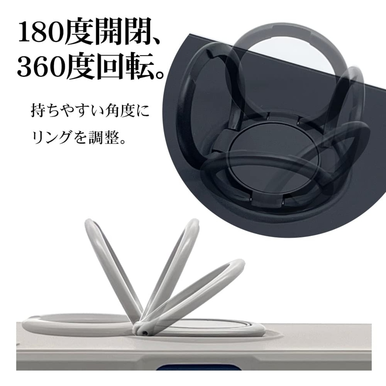 【落下防止リング付き】指が通せて操作安心、視聴スタンドにもなる「フィンガーリング」付き。180度開閉&360度回転で持ちやすい角度に調整可能です。 開いたリングに立てかけることで横置きの視聴スタンドとしても使用できます。(※背面リングを使用する際は必ず端末とケースを一緒に手に持ってください。 背面リングのみを持って宙づりにしたり、振り回す等の行為はしないでください。端末の落下やケースの破損の原因となります。)