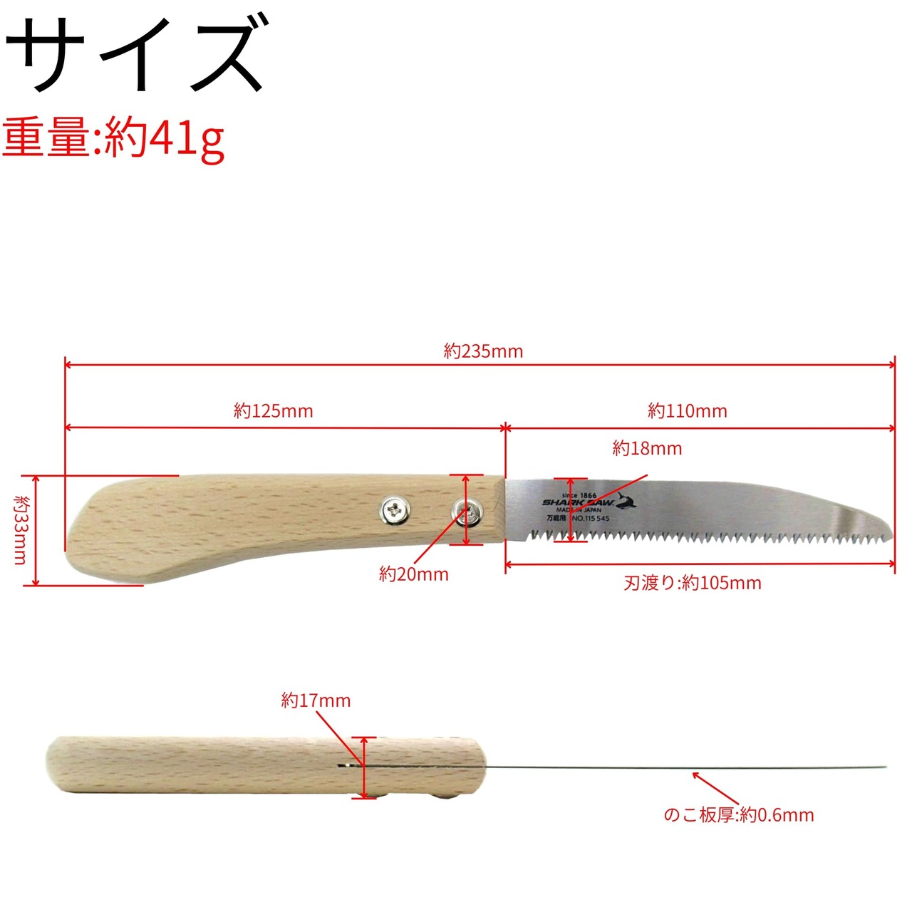 刃部材質:SK-85、のこ板厚:0.6mm、切り溝幅:0.7mm±0.05mm、刃渡り:105mm、刃ピッチ:2.05mm