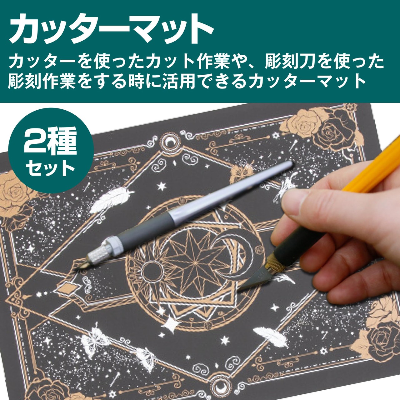 サイズ違いの2種セット:A4サイズとA5サイズの2種類のカッターマットがそれぞれ1枚ずつ揃ったセットですので、作業内容や用途に合わせて使い分け可能です。両面印刷タイプのカッターマットで、表面は魔法陣のデザイン、裏面は方眼入りのデザインとなっております。