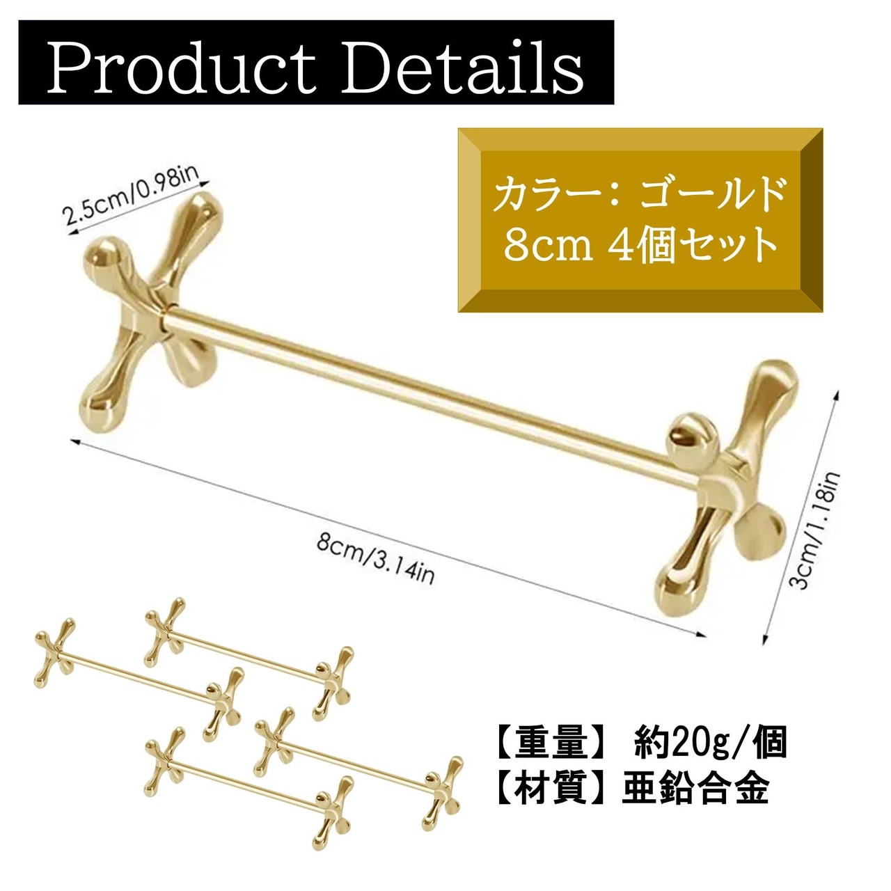 材質は「亜鉛合金製」で、強度、硬度が高く丈夫です。又、ゴールドの色、質感が美しく高級感があります。横幅8㎝ナイフとフォークを並べて置くことができます。4個セットでお届け致します。