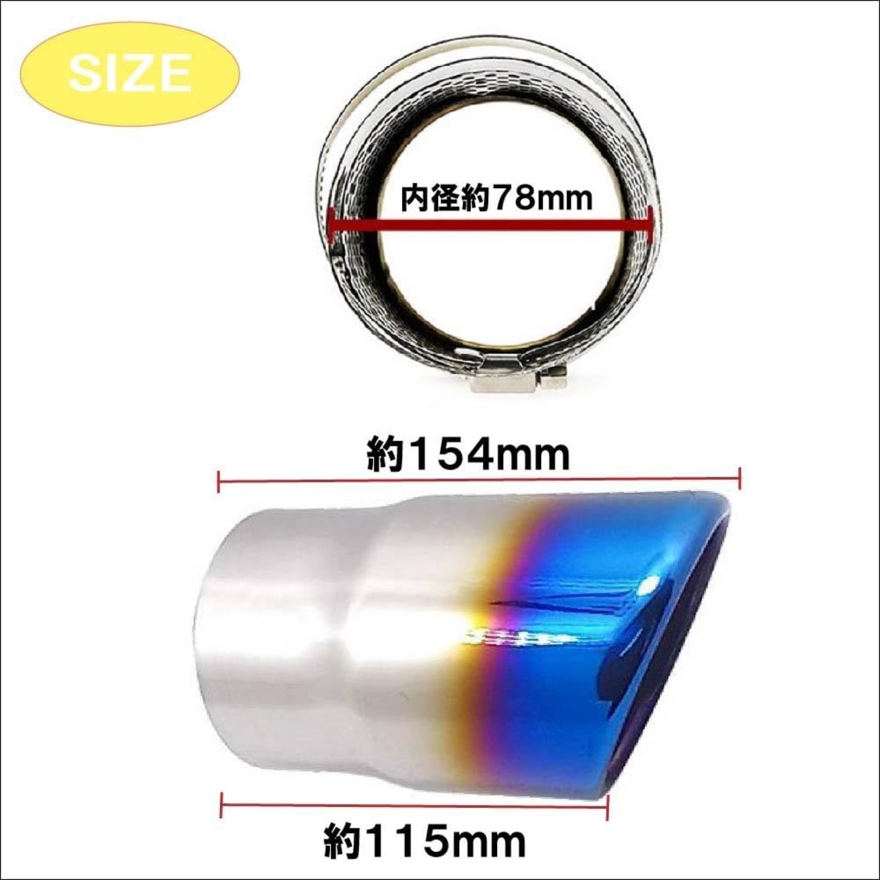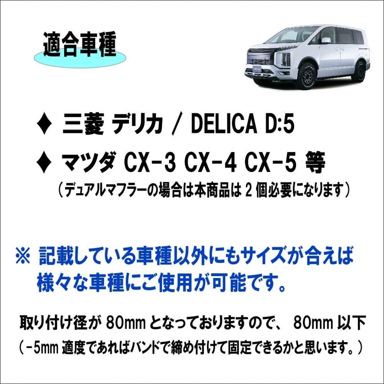 【商品内容】・本体 1個(固定バンド付属)【材質】・ステンレス【サイズ】・画像にて詳細寸法を記載しております【カラー】①ブラック ②シルバー ③ ブルー ④ カラフル 計4種類をご用意しております【参考適合車種】・デリカ / DELICA D5・マツダ CX-3 CX-4 CX-5 等(デュアルマフラーの場合は本商品は2個必要になります) ※ 記載している車種以外にもサイズが合えば様々な車種にご使用が可能です。取り付け径が80mmとなっておりますので、80mm以下(-5mm適度であればバンドで締め付けて固定できるかと思います)
