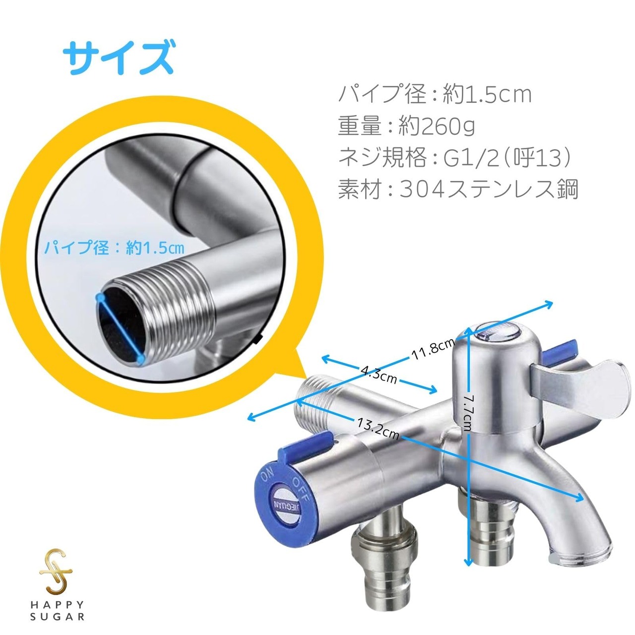 【多機能で効率的な3分岐設計】 一つの蛇口から3つの出水口があり、洗濯・散水・洗車など複数の用途を同時に行えます。作業効率が大幅にアップします。 【世界標準規格で幅広い用途に対応】 G1/2の世界標準規格ネジを採用しているため、ほとんどの家庭の水道に取り付けが可能。洗濯機だけでなく、キッチン、庭の散水、洗車などの様々な場所で活躍します。 【304ステンレス製で丈夫で長持ち】 本体はステンレス一体成型なので、水漏れや亀裂、錆びに強い頑丈な造りです。長期間の使用に耐える丈夫なつくりが魅力です。 【節水設計と手軽なカスタマイズ】 中央の泡沫キャップで節水効果があり、様々なアダプターの取り付けも可能です。用途に合わせてアレンジできる自由度の高さが特徴です。 【サイズ】パイプ径約15mm ネジ規格:G1/2(呼13) 重量:約260g 素材:304ステンレス鋼