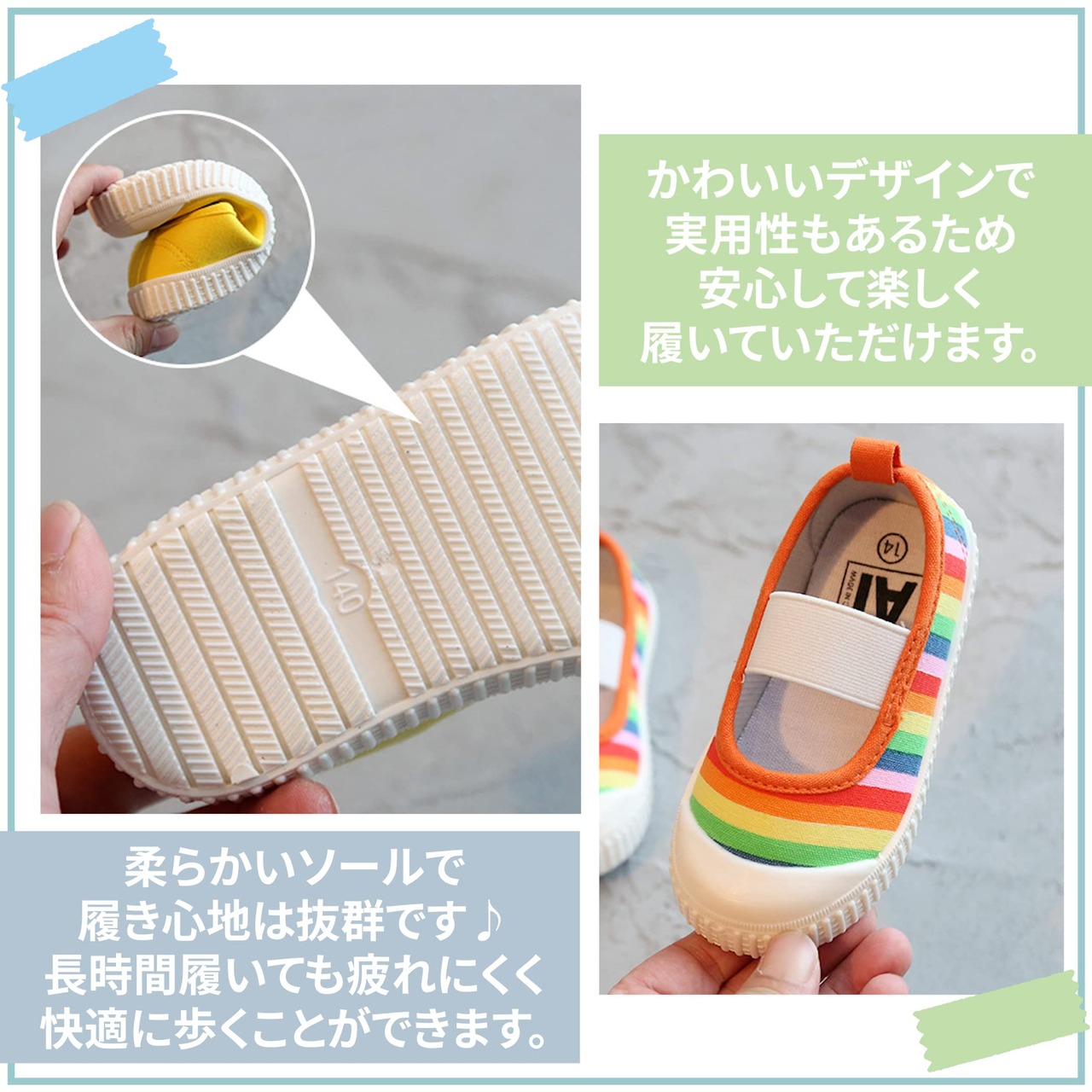 商品仕様:カラー:レインボー サイズ:15.0cm、16.0cm、17.0cm、18.0cm<BR><BR>可愛くて実用的:かわいいデザインやモチーフが施されており子供たちの目を引きます。そのうえ脱げにくく歩きやすい素材を使用しているため、安心して楽しく履いていただくことができます。<BR><BR>柔らかい素材:柔らかい素材を使用しているので、履き心地がとても良いです。また、長時間履いても疲れにくく、快適に歩くことができます。<BR><BR>測り方コツ:サイズ選びは足のかかとからつま先までを測っていただき+1cm~1.5cmのサイズの靴を選ばれると良いと一般的に言われています。(あくまでも目安のサイズです)<BR><BR>ご注意:サイズが合わない時の返品交換は承っておりません。中敷きでも調整できるので、気持ち大きめだと長くお使いいただけます。