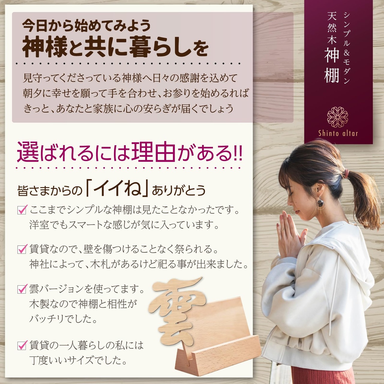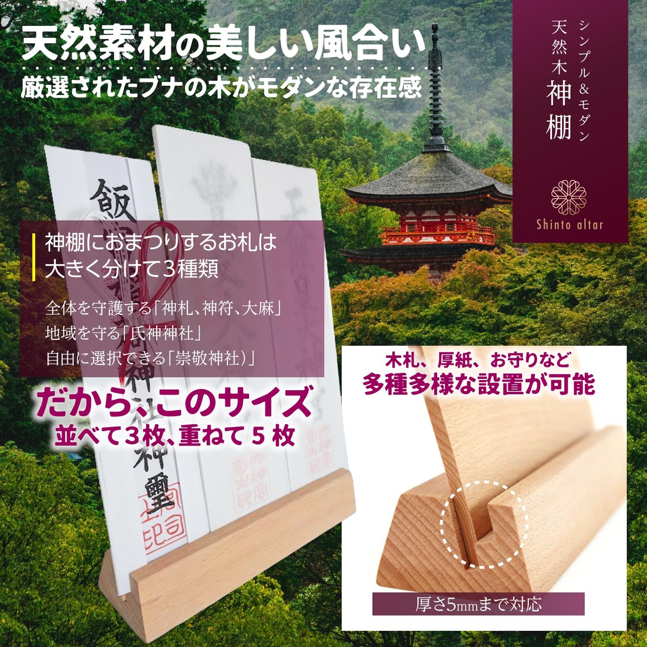 置き型神棚は、お札が3社お祀りできる幅21センチ。目の高さより上の棚や家具の上に置くだけ。壁への穴あけ、天井への固定が不要。賃貸住宅でも使用できます。天然のブナの木使用、優しい色合いでインテリアなじみもよくオシャレ。