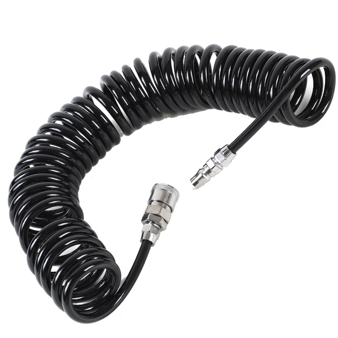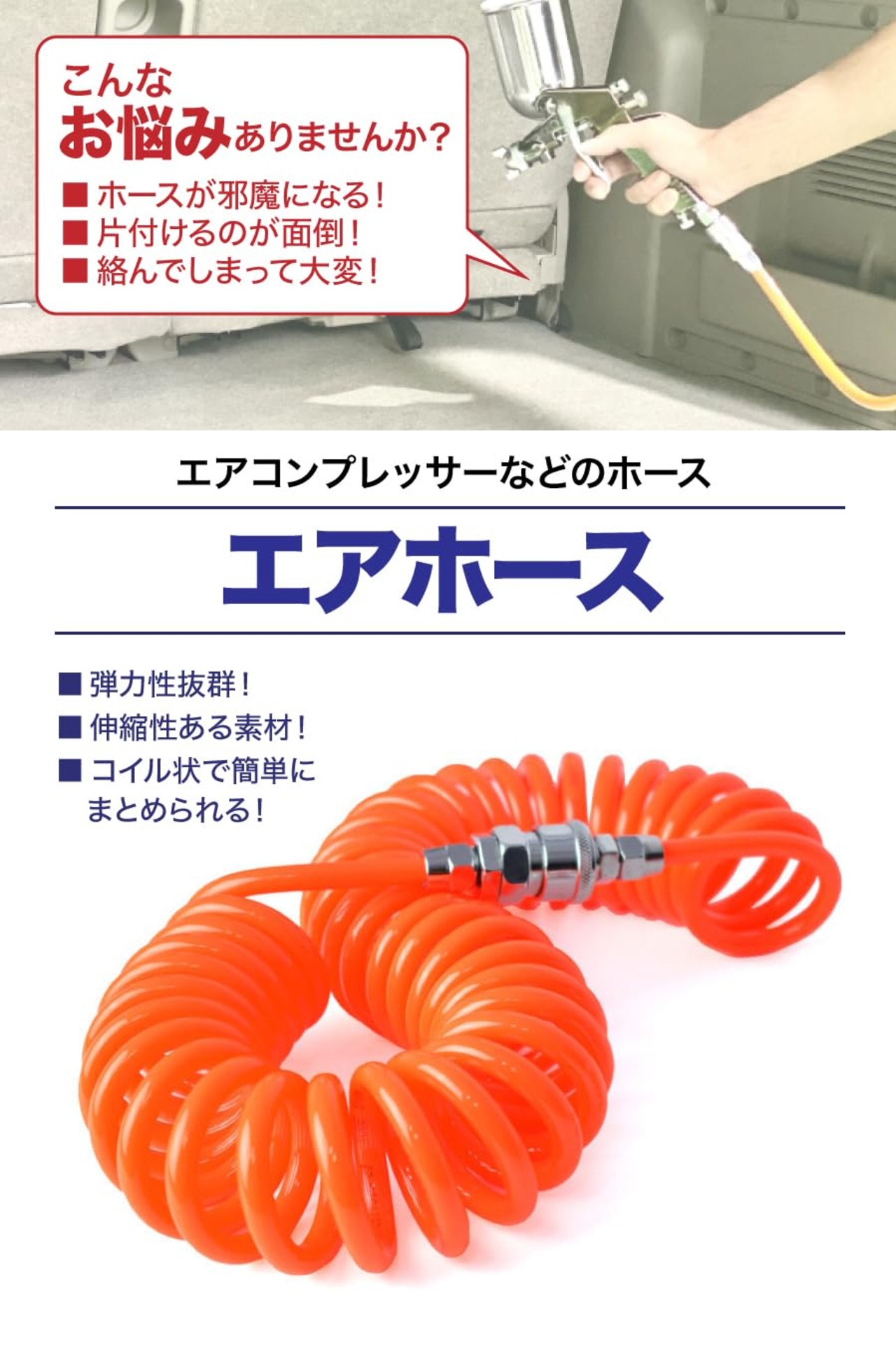 エアーコンプレッサーからの空気を送るエアーホース。両端にワンタッチカプラー(オス・メス)が付いているのですぐに取り付けられ、様々な空気圧縮機と繋いで自動車修理など幅広く活用出来ます。スパイラルタイプなので作業後はホースの巻き取りが不要。後片付けの手間がなく、コンパクトに収納することが出来ます。手元の作業にも使いやすく、約6mまで伸縮可能な作業範囲が広いホースです。ウレタンゴムとも呼ばれる弾力性や抗張力に優れたポリウレタン樹脂(PU)を使用しており、形状変化が起こりにくいのが特徴。破れにくい性質も持つため、長くご使用いただけます。本体:1本 サイズ: 内径5mm、外径8mm 長さ6m 素材:ポリウレタン樹脂 カラー:ブラック