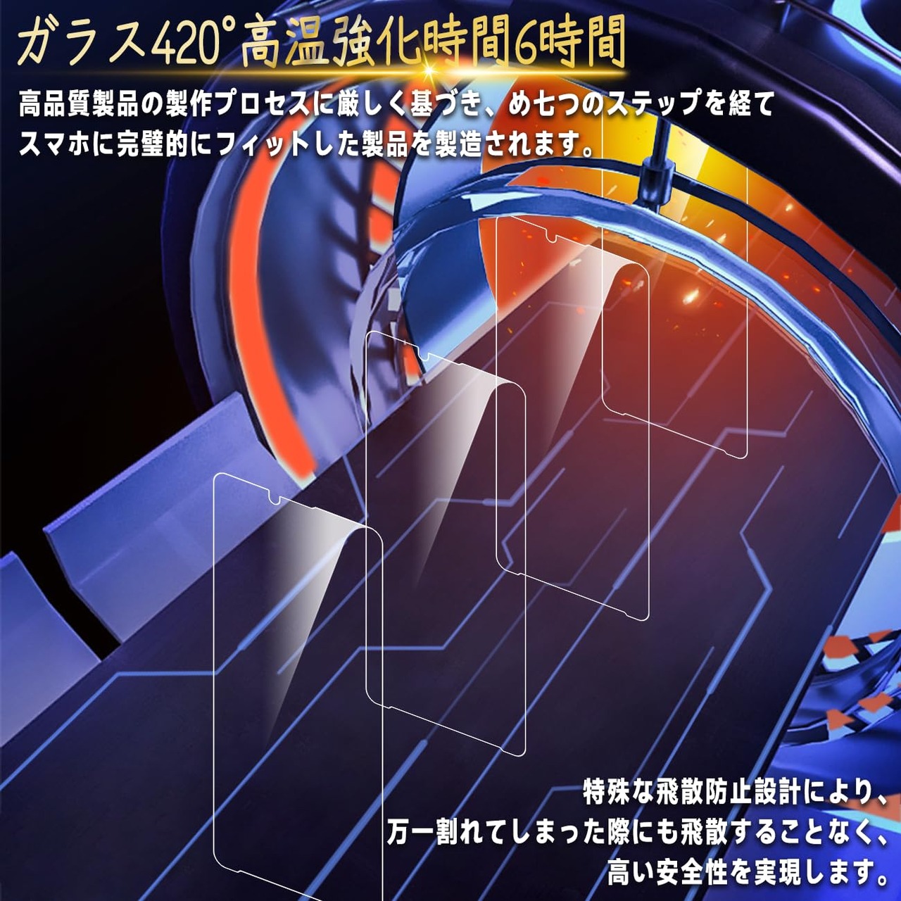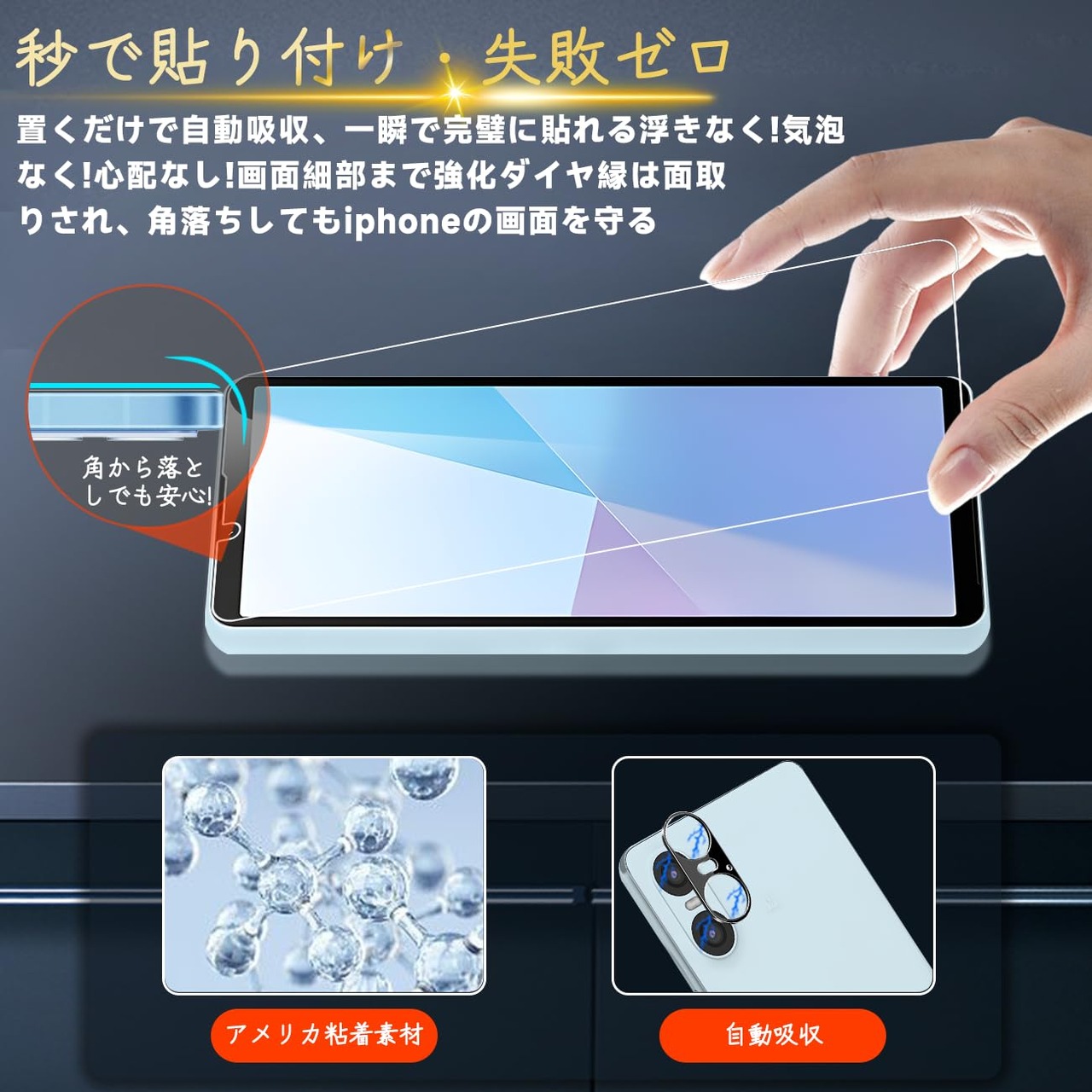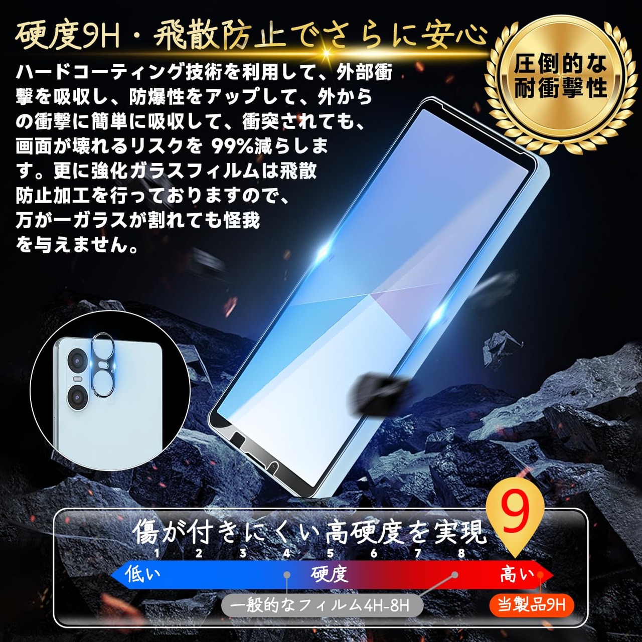 【高品質の材料の9H硬度】とレンズ保護フィルムはすべて旭硝子で作られており、スマホ保護フィルムの中で最高レベルの9H硬度に達しています、4.5時間以上の高温焼入れ処理を行い、スクリーンプロテクターの圧強度は 125mpa に達し、通常 ガラス の 5 倍になりました。しかもスクリーンプロテクターは衝撃を抑えるシリコンコーティングを内蔵しており、万が一ガラスが割れても、ガラスの破片が飛散しません。ハードコーティング技術は、衝撃を最小限に抑えて画面の破損を抑え、すり傷防止や指紋防止もしっかりとスクリーンを保護します。*大切な携帯電話の液晶画面を保護し、衝撃や表面のキズを防止します。