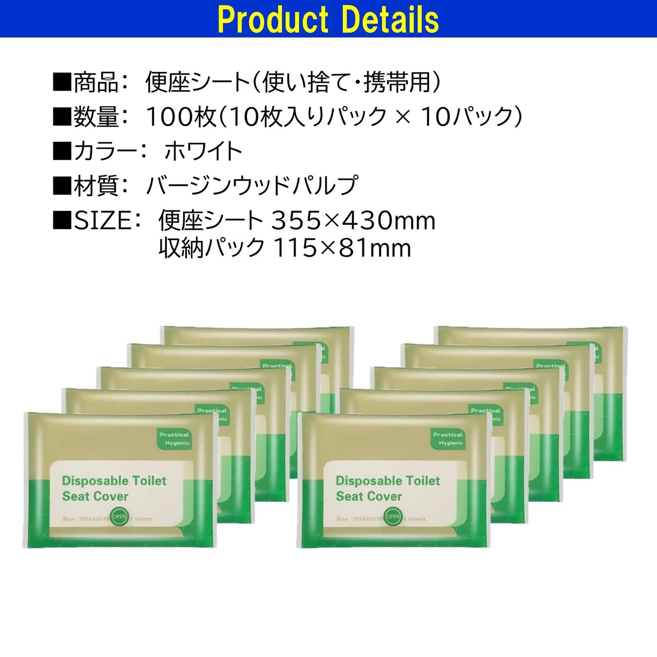商品詳細: 便座シート(使い捨て・携帯用) 【数量】100枚(10枚入りパック×10パック) 【カラー】 ホワイト 【材質】 バージンウッドパルプ 【サイズ】 便座シート 355×430mm / 収納パック 115×81mm
