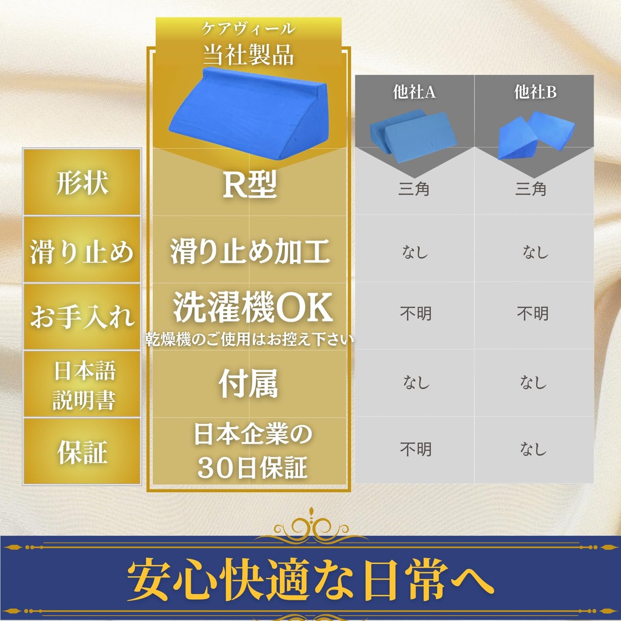 【高反発素材】 弾力性に優れながら、身体が沈み込まない適度な硬さでしっかりと支えます。計算された介護に最適な斜めの角度38度で体の曲線に合わせて体勢をキープでき、側臥位・仰臥位時の除圧、足上げ、寝返りの介助をスムーズに行えます。高反発素材により、身体への負担が軽くなります。これにより、被介護者は快適に過ごすことができ、介護者も簡単に介助を行うことができます。