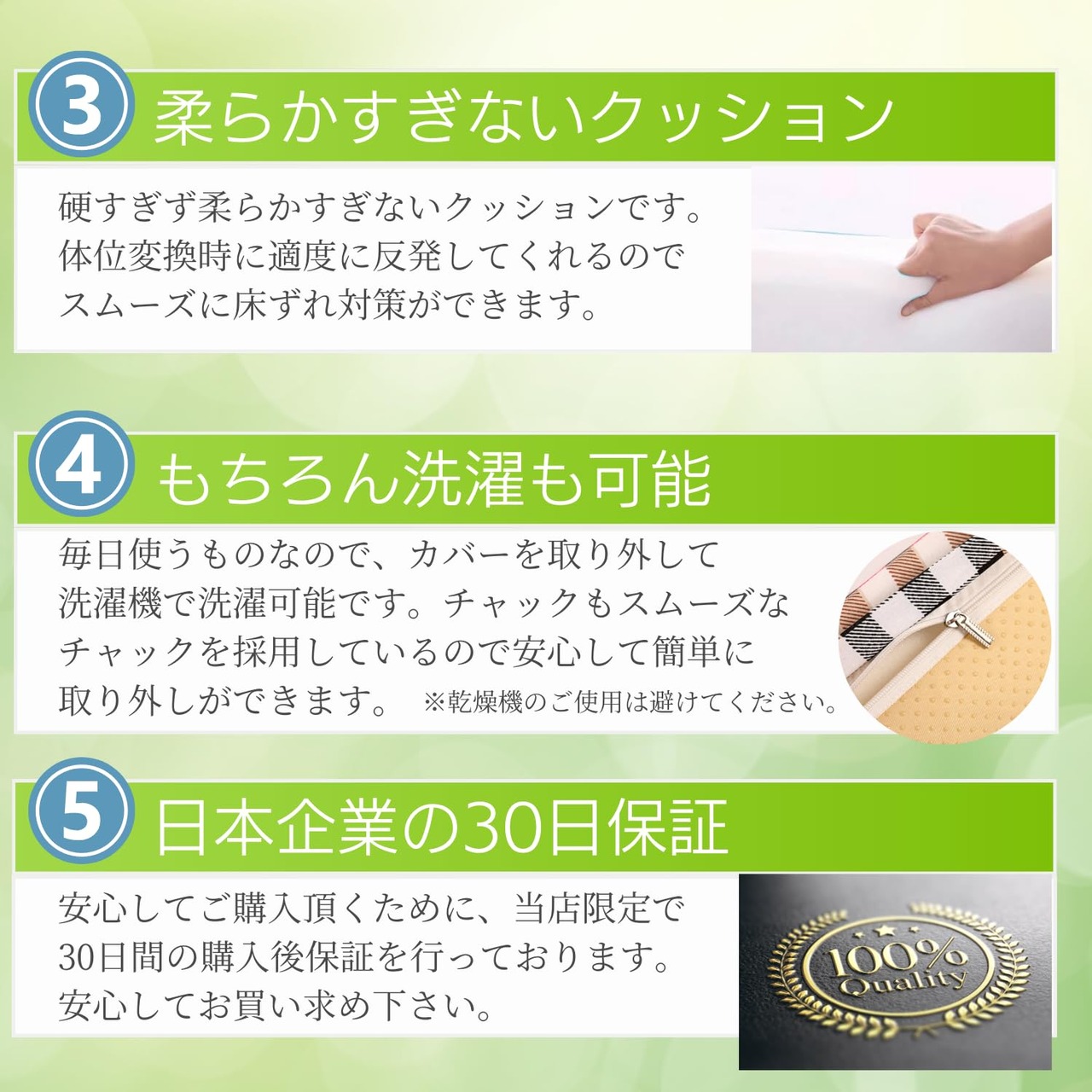 【滑り止め加工】 底面に滑り止め加工が施されており、サラサラとしたシーツの上などでも滑りにくく使用が簡単です。これにより、クッションがずれる心配がなく、簡単に使用できます。滑り止め加工により、クッションがしっかりと固定されるため、被介護者の体勢が安定しやすくなります。これにより、長時間使用しても快適さが保たれます。