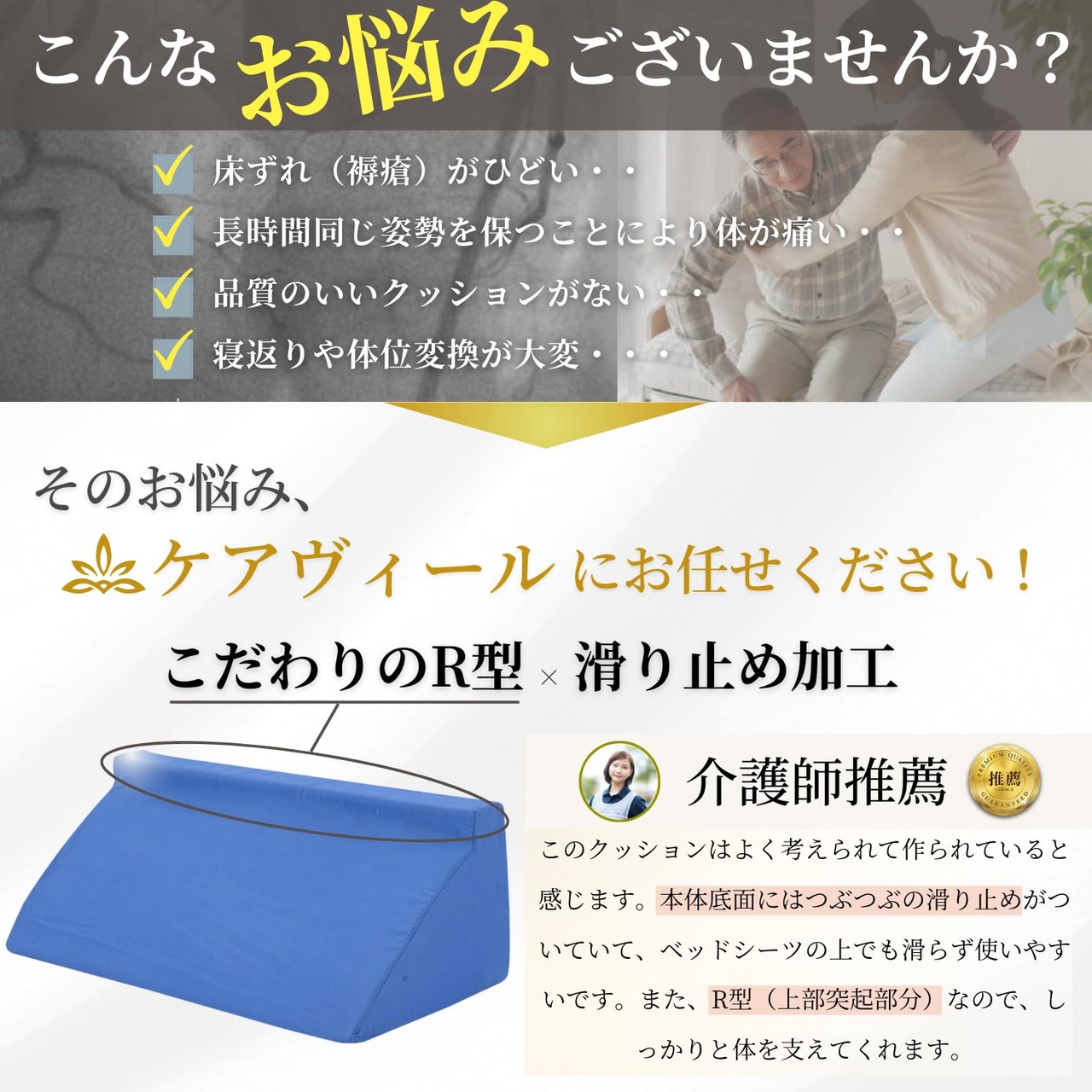 介護生活を支えるために開発された「ケアヴィール 介護用クッション」は、寝返りが難しい方の体位変換や姿勢保持をサポートし、床ずれの対策となります。適度な硬さと高反発の弾力性を持つこのクッションは、介護者と被介護者の両方にとって便利で負担軽減を実現します。