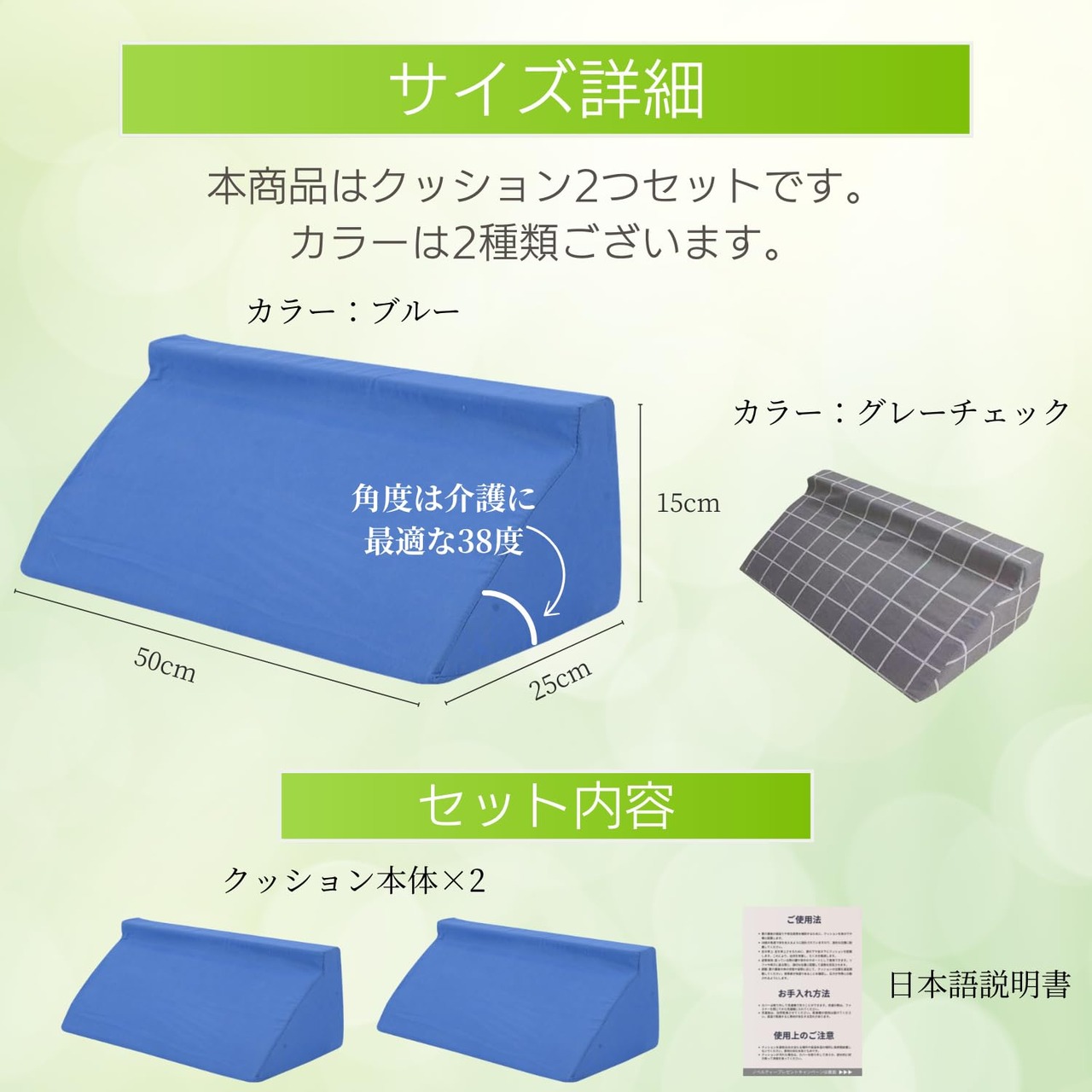 【セット内容】 介護用三角クッション×2点、日本語説明書付き。これにより、すぐに使用を開始でき、使い方も簡単に理解できます。サイズ: 横幅50cm、奥行25cm、高さ15cmで、適度な大きさで使いやすく設計されています。これにより、様々な体型の方に対応でき、快適に使用できます。