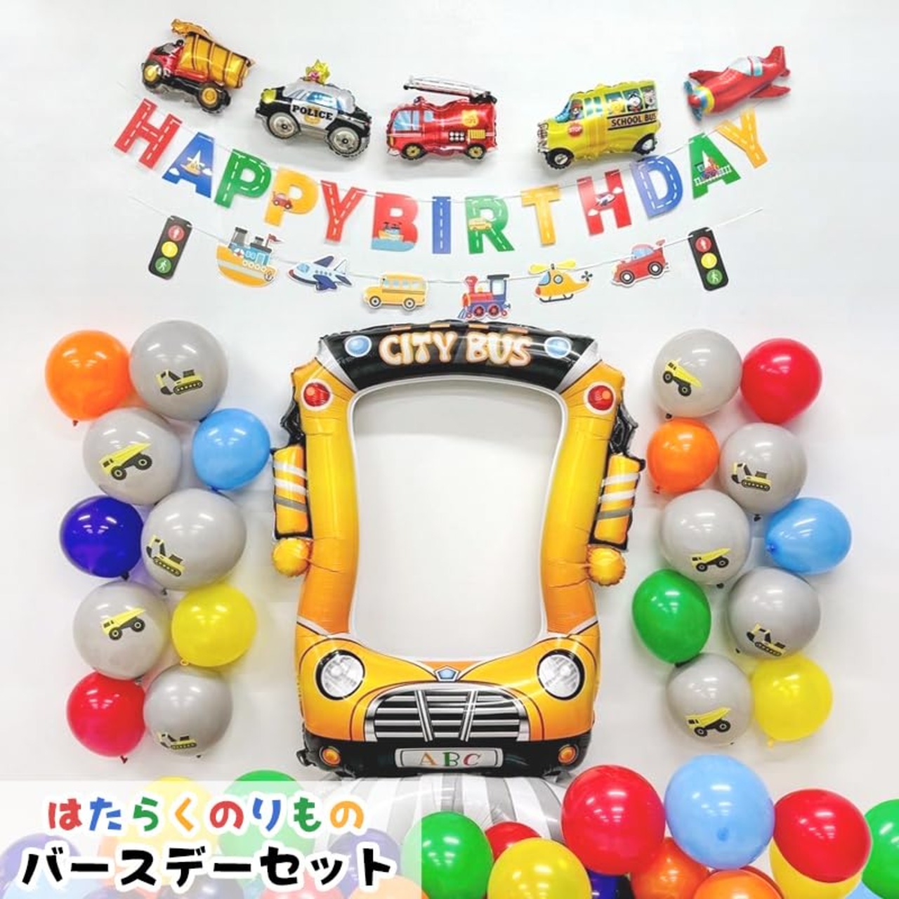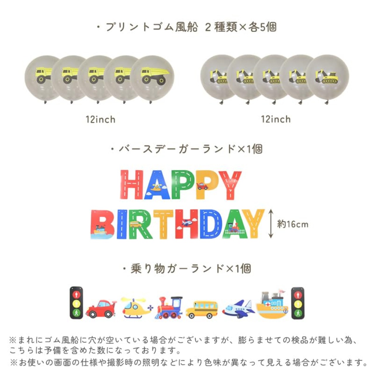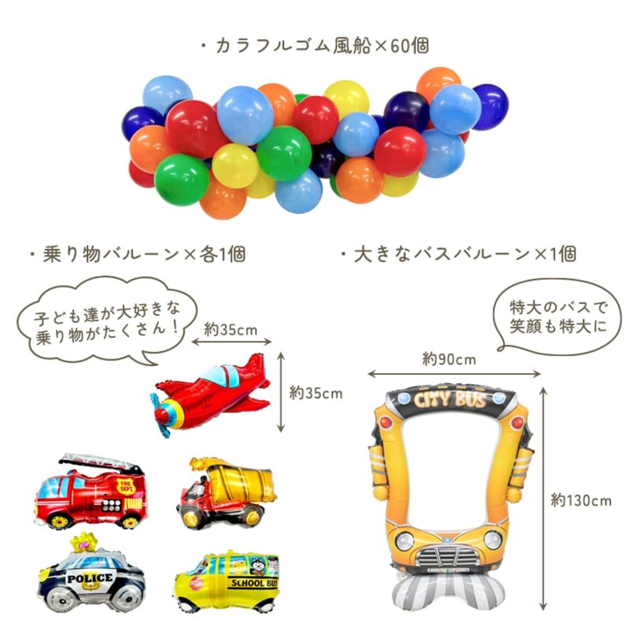 【セット内容】カラフルゴム風船 ×60個、乗り物バルーン 約 35cm × 各1個、大きなバスバルーン 約 90cm×130cm × 1個、プリントゴム風船 2種類 12inch × 各5個、バースデーガーランド × 1個、乗り物ガーランド × 1個
